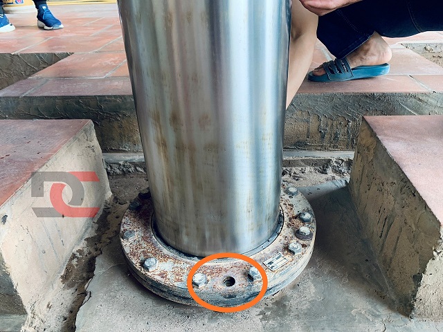 - Tiến hành cho lên xuống cầu để xả e cầu nâng 1 trụ. Tại vị trí ty ben cầu, sẽ có một lỗ để chúng ta xả e như hình ảnh bên dưới, dùng lục giác vặn nới lỏng ốc để dầu chảy ra không còn bọt khí, chúng ta sẽ vặn vào.