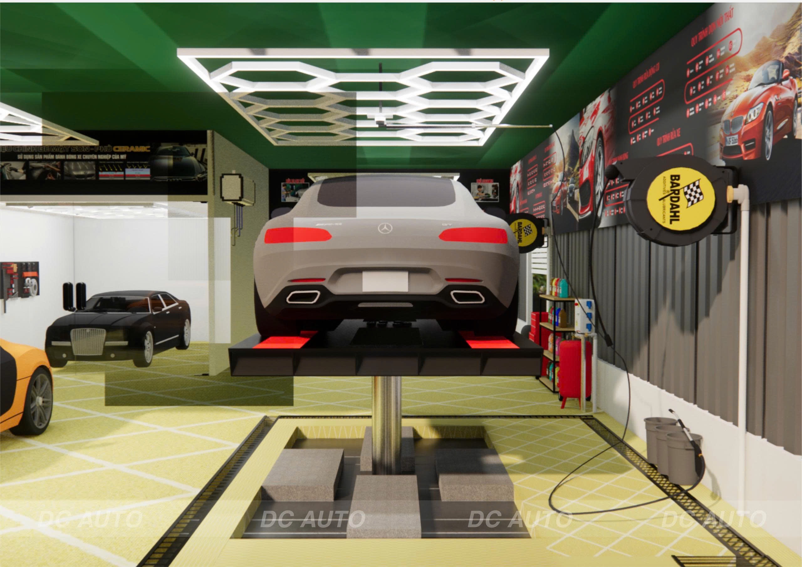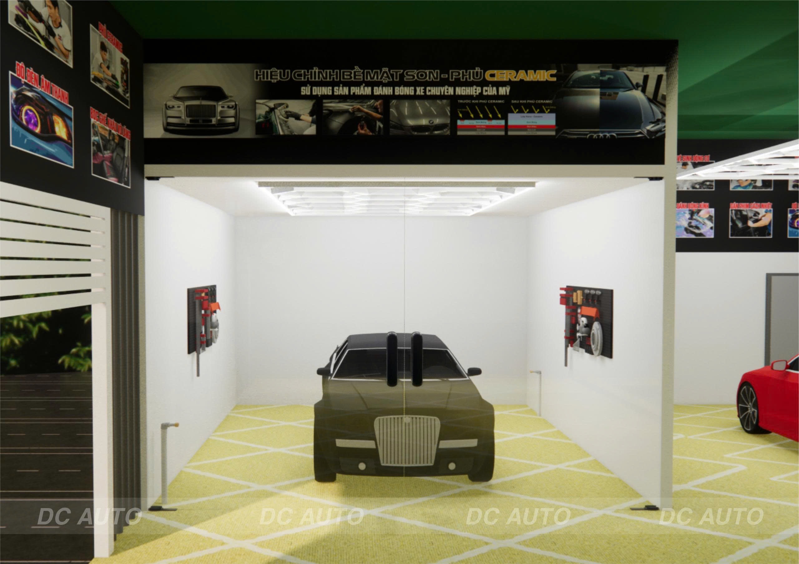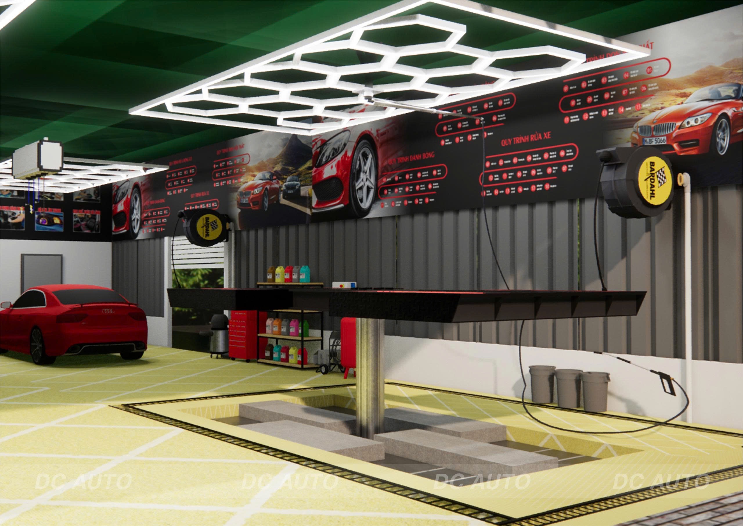 - Khu vực chăm sóc chi tiết – detailing đặt ở vị trí trung tâm, đảm bảo đủ ánh sáng và không gian thao tác.