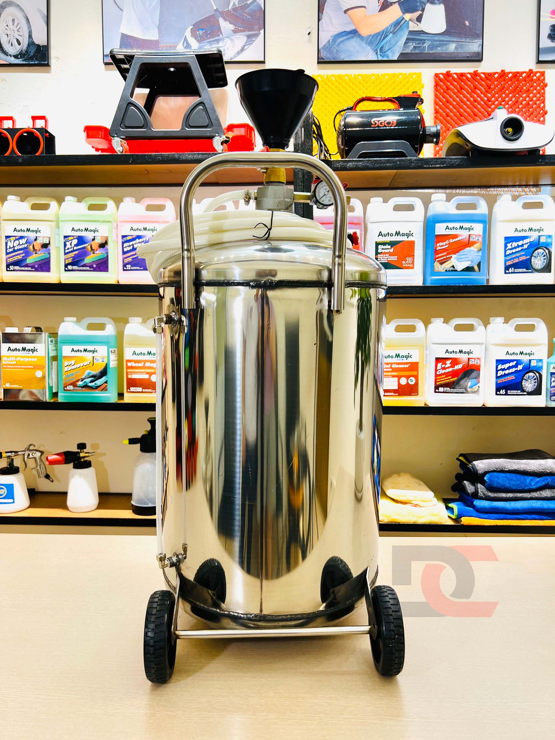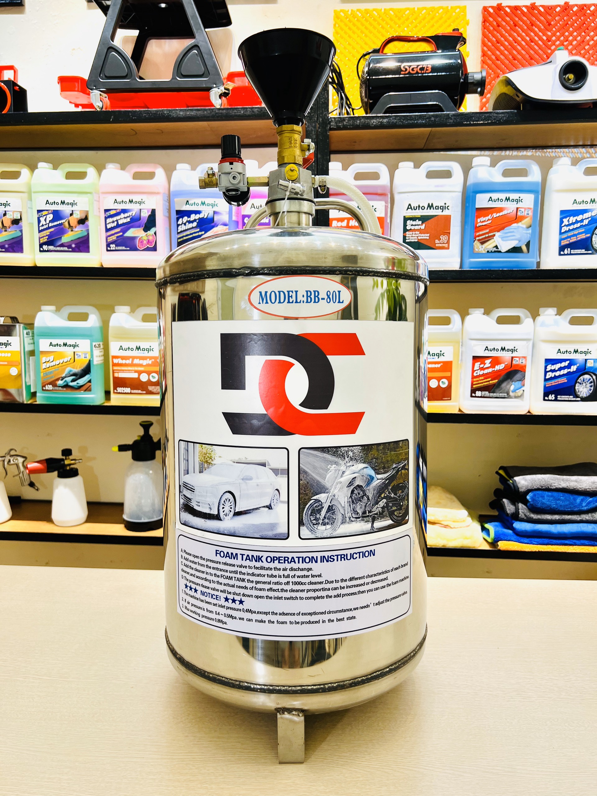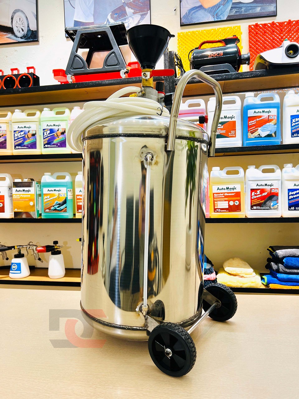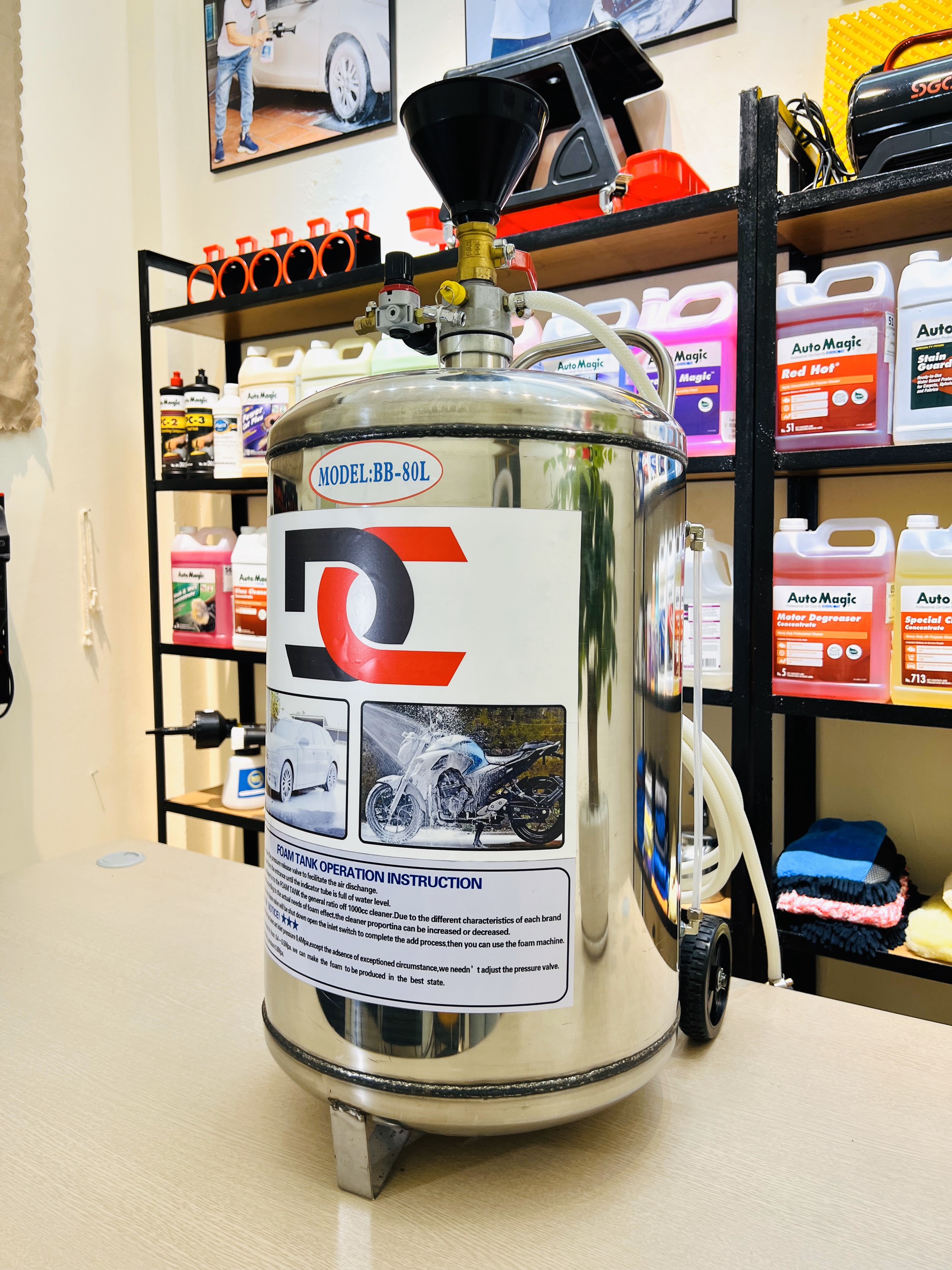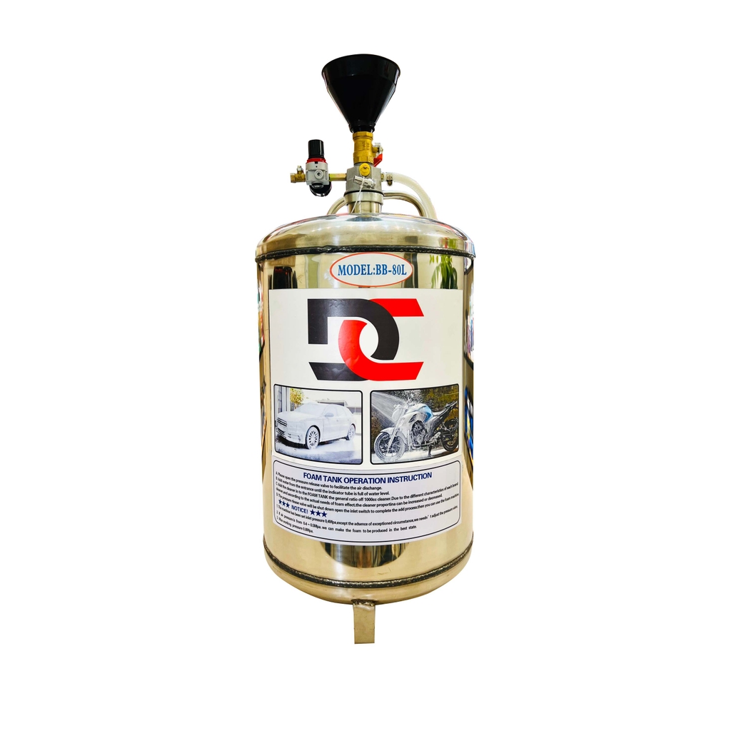 Bình bọt inox DC BB-80L, thương hiệu DC, hiện đang là bình phun bọt tuyết có dung tích bình chứa lớn nhất hiện nay, được sử dụng chủ yếu trong các tiệm rửa xe và các trung tâm chăm sóc xe chuyên nghiệp vừa và lớn, đáp ứng được lượng xe từ 30-40 lượt/ngày. Bình bọt là thiết bị hoà tan hỗn hợp dung dịch rửa xe thành dạng bọt bông, bọt mịn phủ lên các bề mặt xe, giúp việc rửa xe nhanh, dễ dàng và sạch hơn. Nhân viên rửa xe không phải loay hoay trong quá trình pha chế hỗn hợp rửa xe.