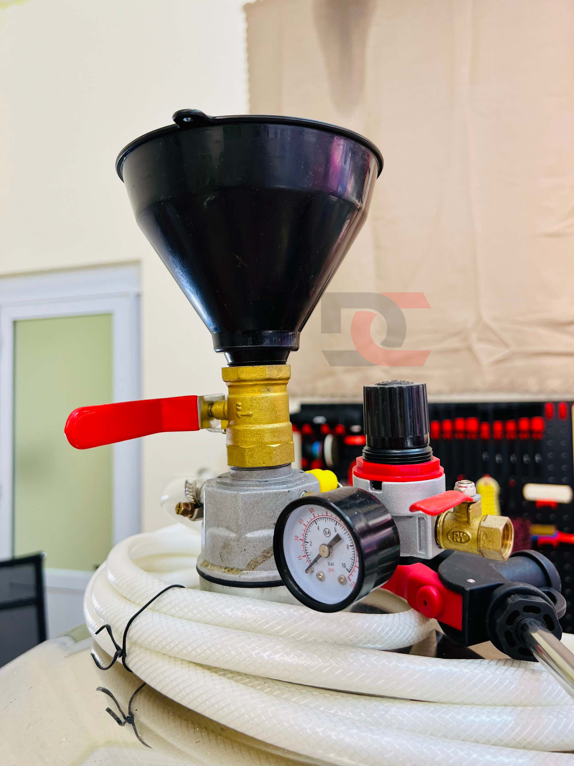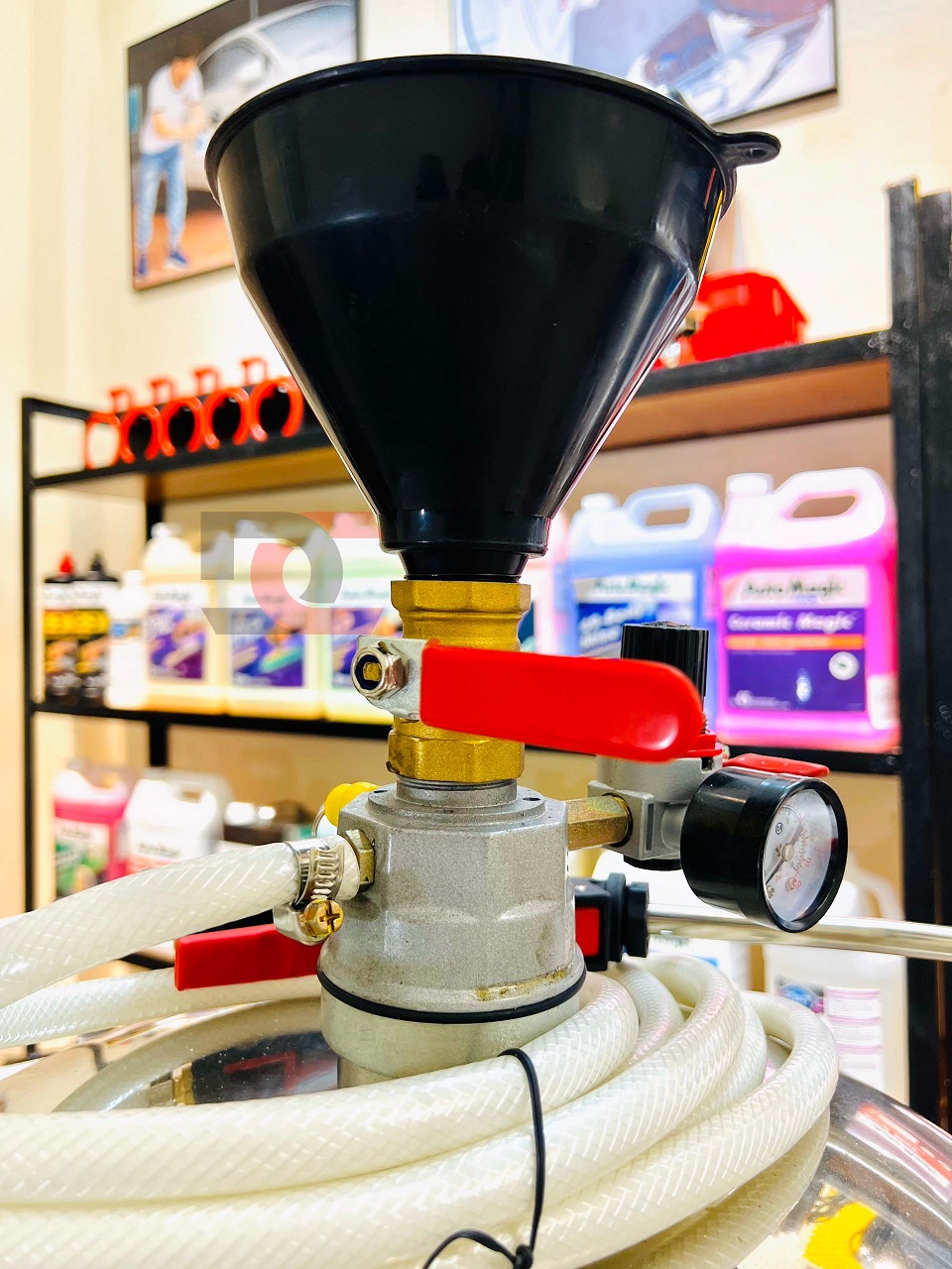 Đặc biệt bình bọt inox DC BB-80L có bộ chỉnh áp và đầu cấp hơi được thiết kế ngay bên trên phần cổ bình để tránh trường hợp khi van 1 chiều, bộ chỉnh áp bị hỏng làm đẩy toàn bộ bọt ngược vào bên trong đường dẫn dầu, vào bên trong bình máy nén khí, máy hút dầu thải hay bình chứa dầu cầu nâng 1 trụ, làm hỏng các thiết bị.