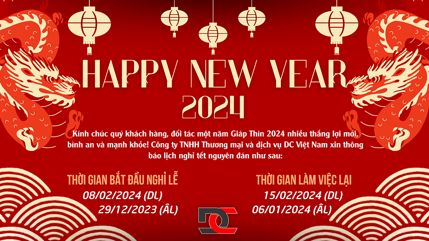 Cung chúc tân xuân, tấn tài tấn lộc, Công ty TNHH TM&DV DC Việt Nam xin gửi tới Quý khách hàng, Quý đối tác lịch nghỉ lễ như sau: