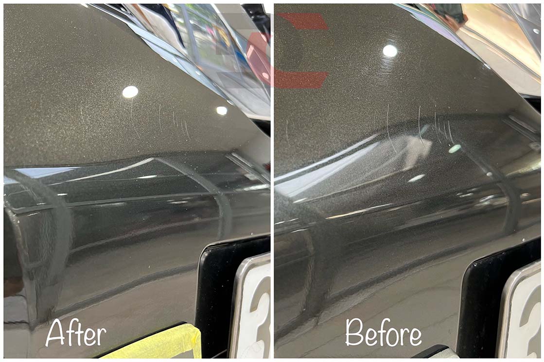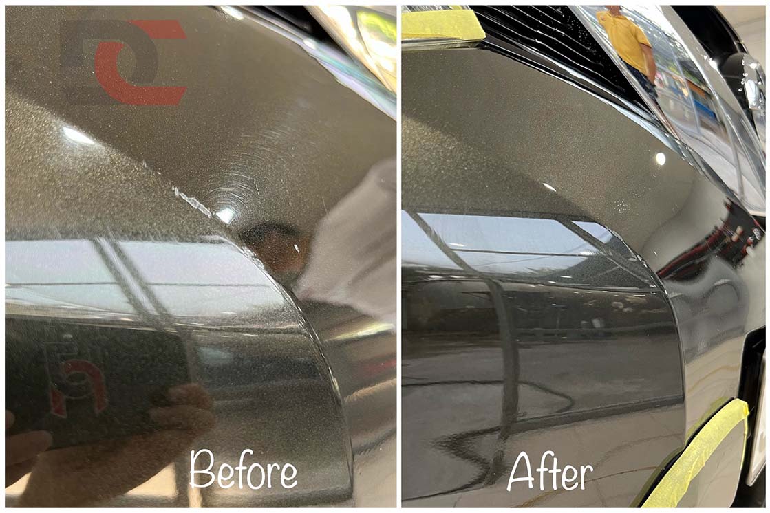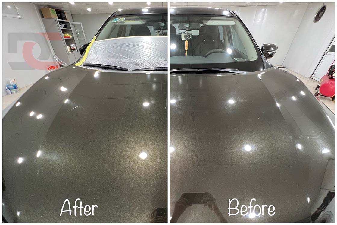 Những vết va chạm trên đầu xe sẽ làm mất bề mặt sơn, những vết như này sẽ không thể xử lý được. Các Detailer nên khuyến khích khách hàng đi sơn lại những phần đó trước khi mang xe đến đánh bóng.