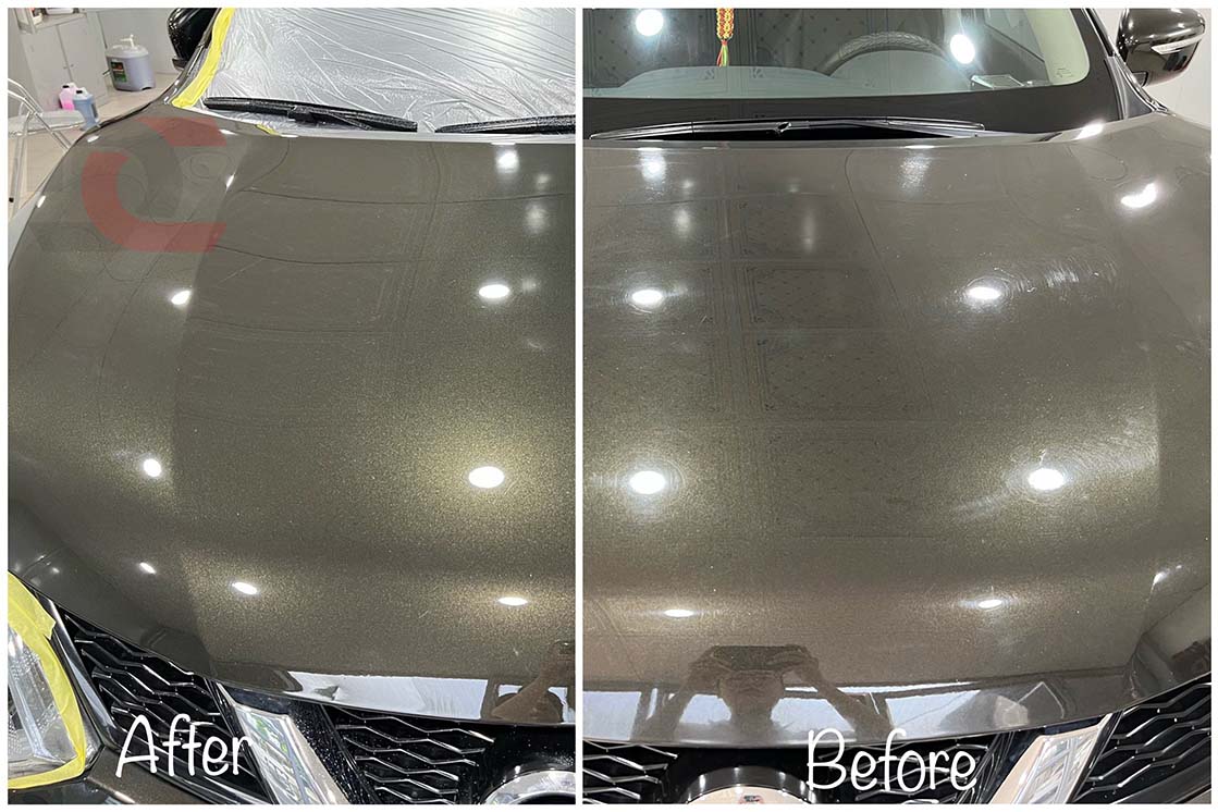 Trên nắp capo sẽ có 1 số vết xước do cành cây, ngoại cảnh tác động, thường là những vết xước dài, nhưng độ sâu vào hết lớp sơn bóng. Những vết này chỉ nên đánh bóng làm mờ, không nên hạ sâu, vì khi đó đồng nghĩa những khu vực xung quanh vết xước cũng sẽ bị mất lớp sơn bóng, mài mòn bề mặt sơn.