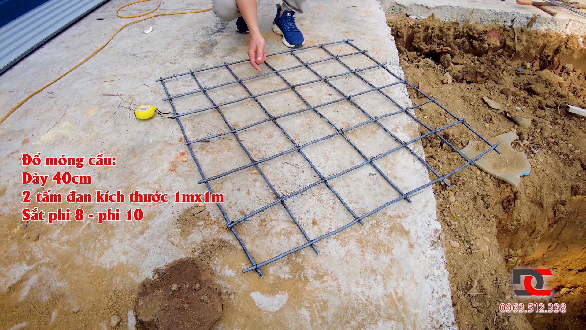 - Làm phần móng: đan 2 tấm đan sắt phi 8 - phi 10, đổ bê tông độ dày 40cm, hạ xuống phần tâm cầu vừa đào. Từ phần mặt móng đến mặt cos nền 0:0 đạt đủ 2m27