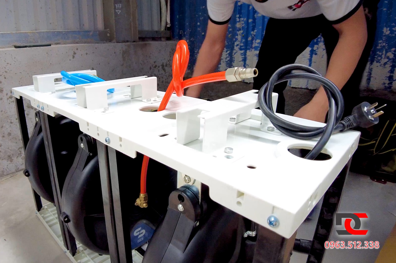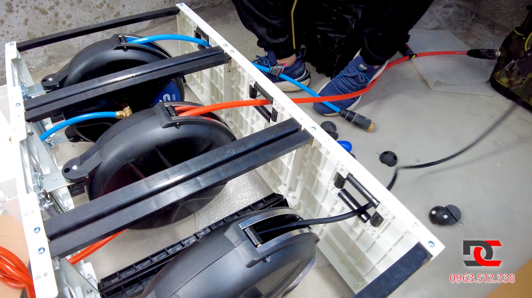 Lắp cuộn rulo vào bên trong khung hộp, nếu lắp cả 3 cuộn thì nên đặt cuộn hơi ở giữa, nước và điện tách riêng 2 đầu để tránh sự cố