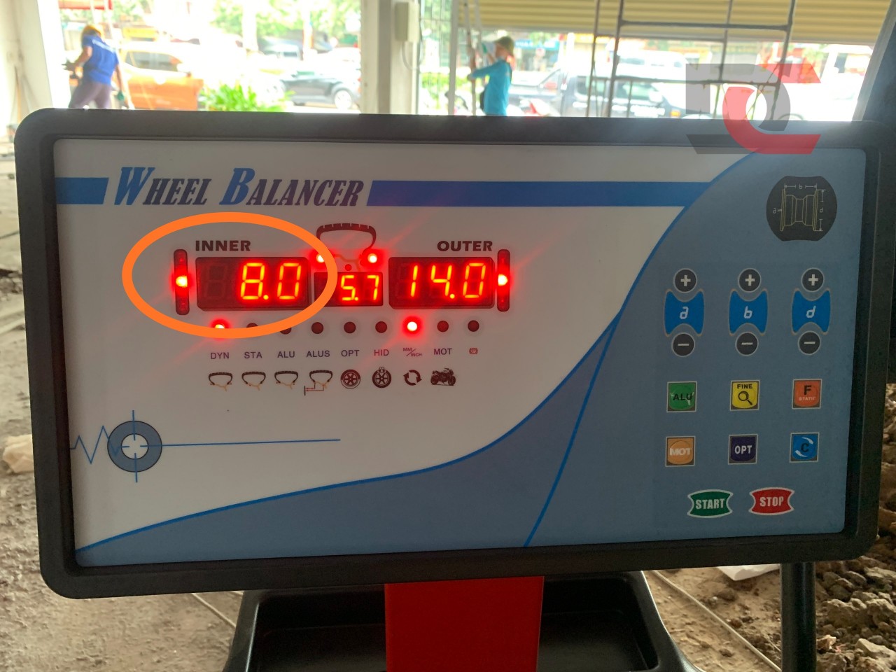 Bước 4: Ấn nút START và đóng nắp che xuống và bắt đầu quá trình quay bánh cân mâm, để xác định vị trí đóng chì. Quá trình quay mâm mất khoảng 6-9 giây. Màn hình điện tử sẽ thể hiện thông số đang bị sai lệch ở mép lazang trong và ngoài là bao nhiêu.