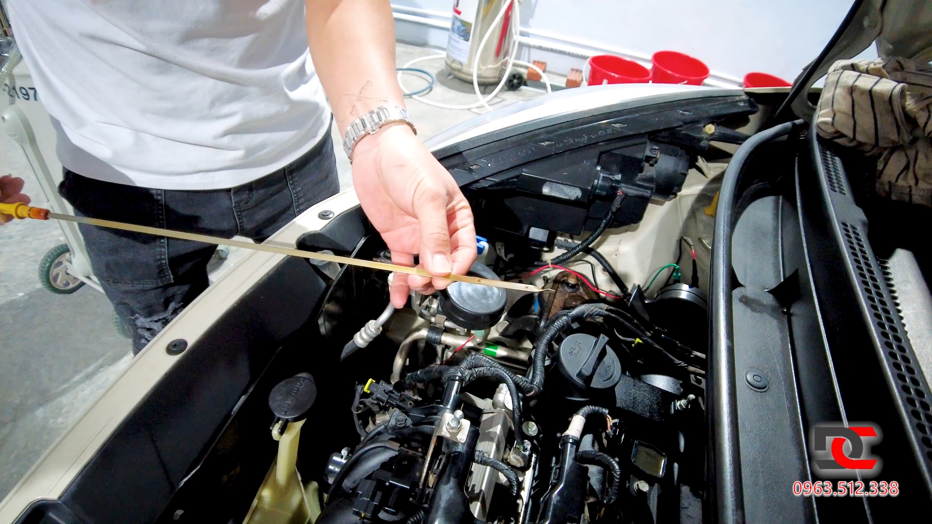- Rút thước thăm dầu trong động cơ để kiểm tra mức dầu hiện tại