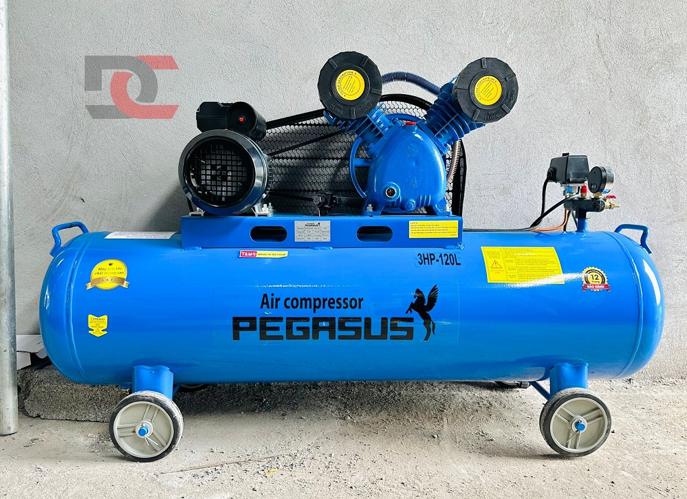 01 Máy nén khí Piston Pegasus - Model: TM-V-0.25/8-120L, bình chứa 120 lít, đáp ứng đủ lượng khí cần dùng cơ bản cho trung tâm chăm sóc xe,