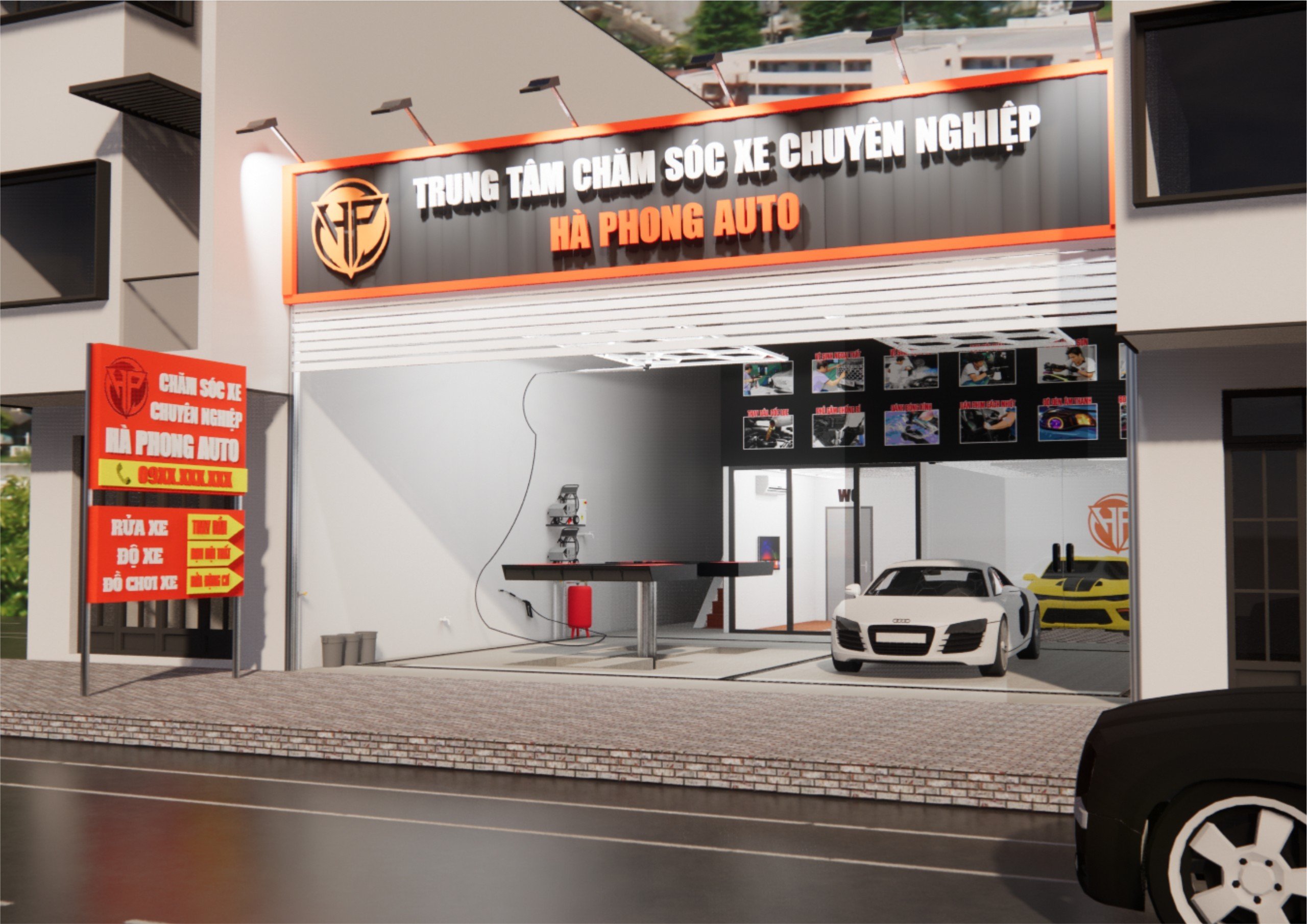 Hà Phong Auto với diện tích tổng thể là 160m², mặt tiền rộng 10m, sâu vào bên trong là 16m, được chia ra thành hai khu vực dịch vụ chính cùng các phòng chức năng. Khu vực dịch vụ rửa xe có cầu nâng, khu làm dịch vụ khô như: dọn nội thất, rửa máy, vệ sinh ngoại thất, làm lốp,...Phía bên trong có phòng phủ ceramic, phòng khách, một phòng vệ sinh và được thiết kế hành lang có gác xép phía trên.