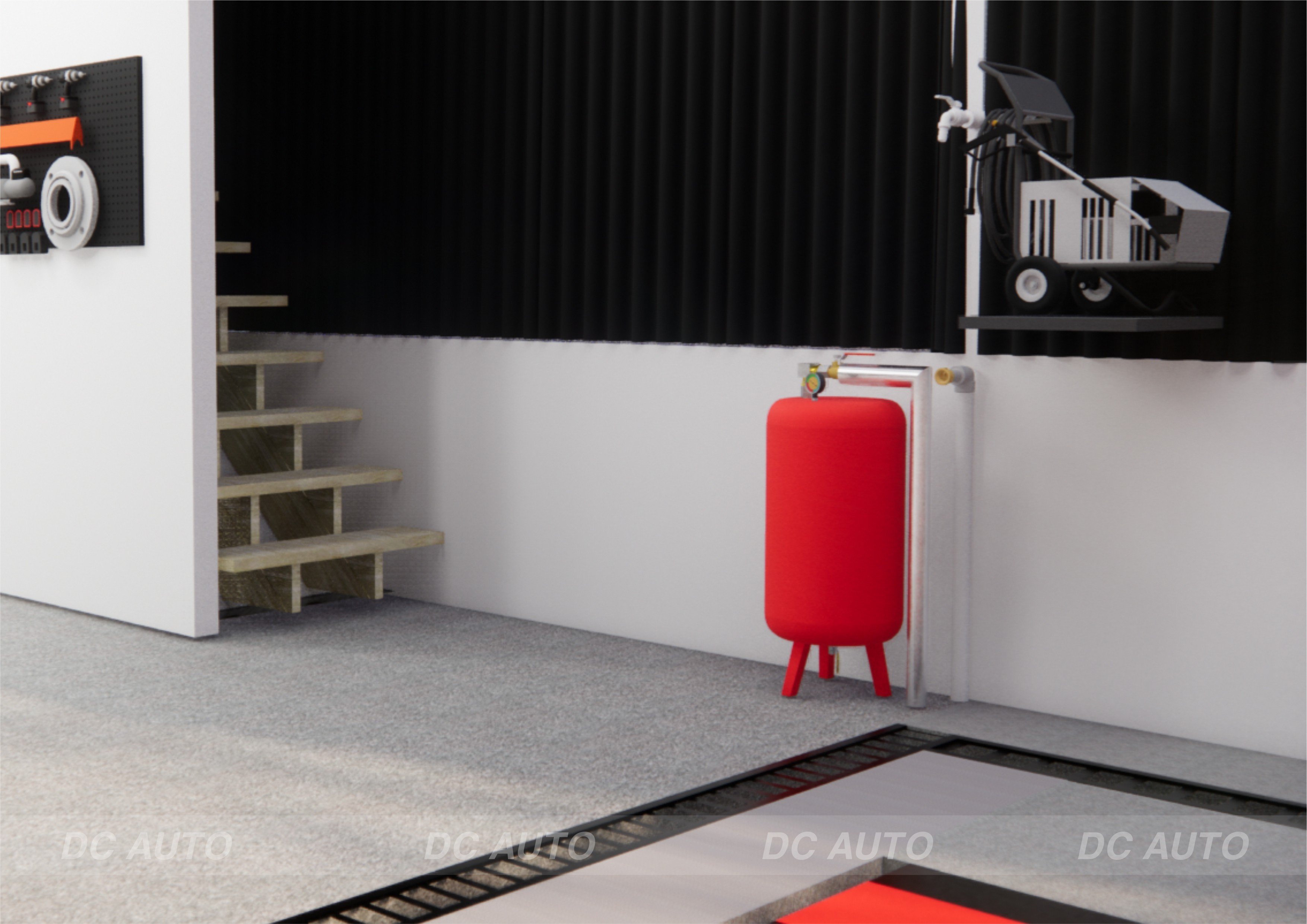 Đi vào bên trong là khoang dịch vụ làm khô, làm nội thất và phòng vệ sinh. Máy nén khí Piston Pegasus TM-V-0.67/12.5-330L được đặt gần ngay phía trên phòng vệ sinh, từ vị trí máy nén khí sẽ lắp đặt cầu thang đi lên gác xép bên trên. Gác xép bên trên rộng ra 4m được thiết kế làm phòng tiếp khách và phòng nghỉ cho nhân viên. Toàn bộ đường hơi được chạy ra bên ngoài, 5 đường hơi bao quanh khu vực nhà xưởng.