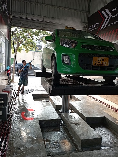 Đi từ phía bên ngoài vào trong, HD Auto được chia ra làm hai khoang dịch vụ chăm sóc xe cơ bản. Phía bên ngoài chính là khoang dịch vụ rửa xe có cầu nâng, cầu nâng 1 trụ Airtek Ấn Độ, kiểu bàn nâng cánh bướm, âm nền được lắp đặt ngay phía ngoài. Bên trên cầu nâng 1 trụ được lắp đặt một tay quay rửa xe 360° kết nối với máy rửa xe cao áp Jetta - Model: JET7500P-250T hiệu suất phun rửa cực kì mạnh mẽ.