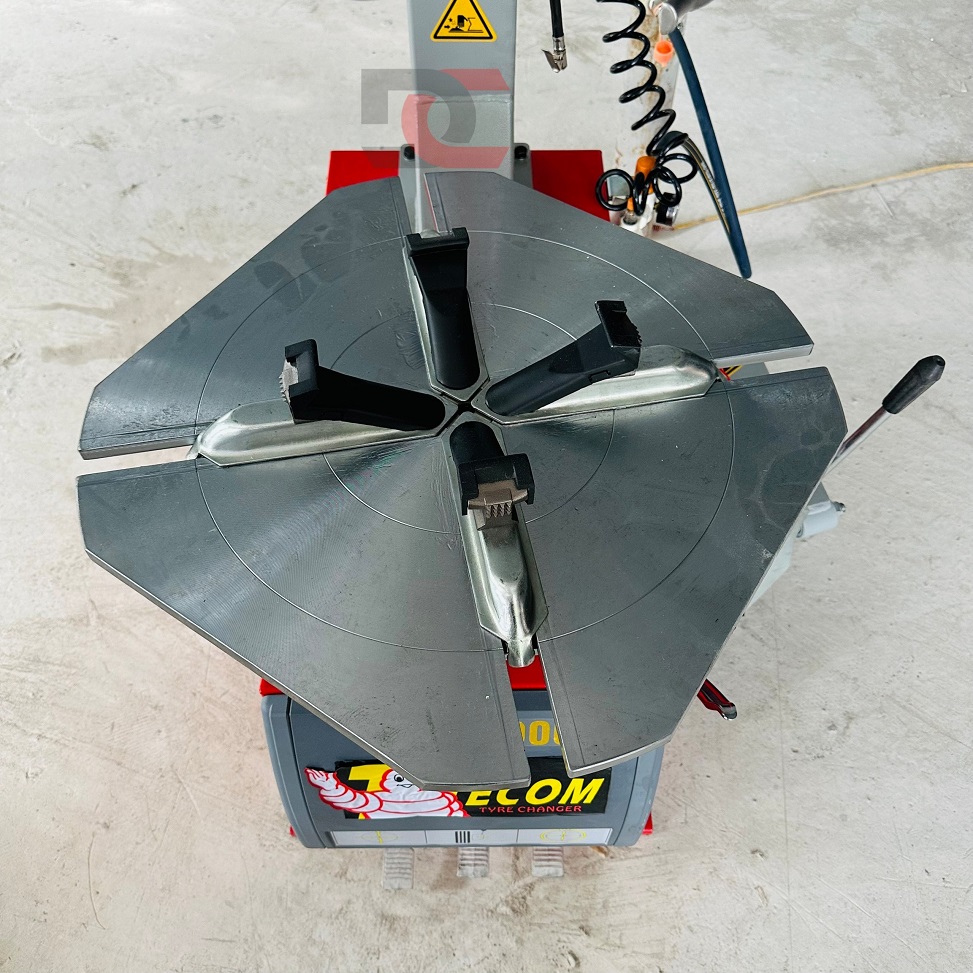 Máy ra vào lốp xe ô tô, xe máy Tecom - Model: TC-900E sử dụng nguồn điện 220V và hơi khí nén để hoạt động. Bao gồm các bộ phận cơ bản: