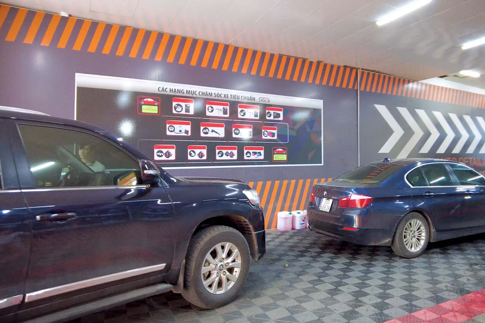 Ngay bên cạnh khoang làm gầm chính là phòng đánh bóng và dọn nội thất. Không gian có thể làm song song 2 xe cùng lúc. Các sản phẩm hóa chất, dụng cụ thi công được để ngay trong phòng này.