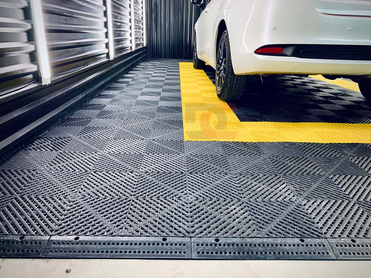Nếu lắp sàn ở khu vực rửa xe, các bạn nên đo sàn nhựa kèm cả đầu thanh chặn dài hơn chiều rộng rãnh thoát nước, nhằm mục đích tránh nước dính vào lốp khi xe đi lên, giúp xưởng sạch sẽ hơn, và rãnh thoát nước cũng được che đi 1 cách tự nhiên nhất.