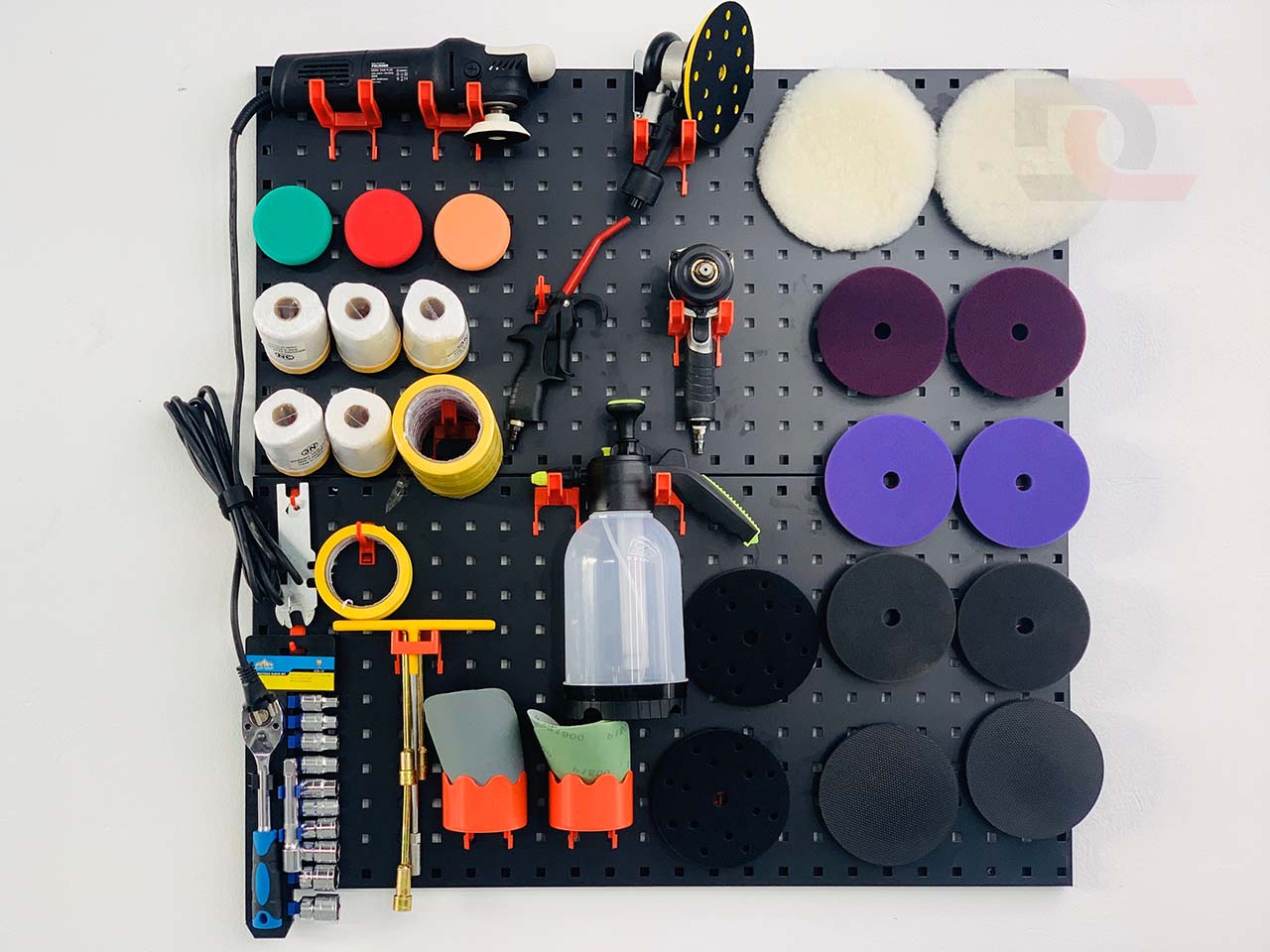 Bảng treo dụng cụ, giá treo máy đánh bóng, giá treo bình xi, ghế đánh bóng, đèn sấy hồng ngoại, cuộn dây hơi tự rút, v....v....