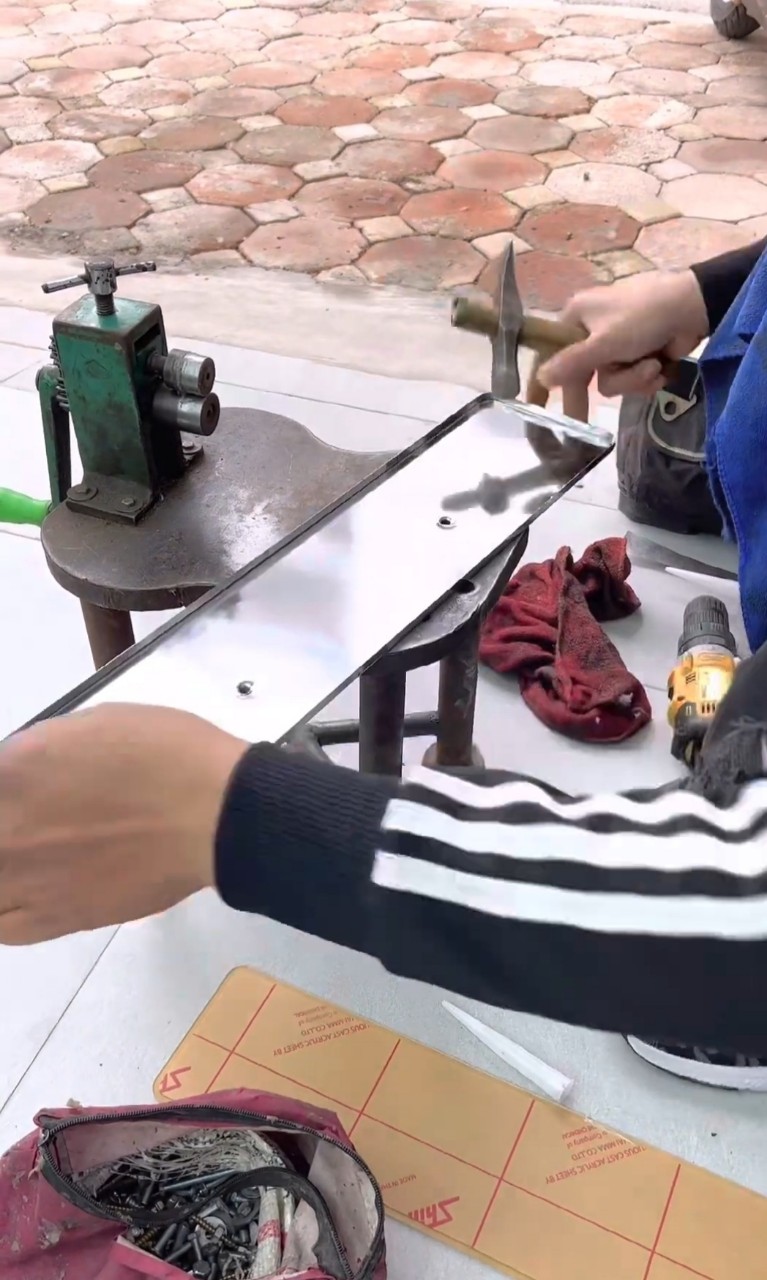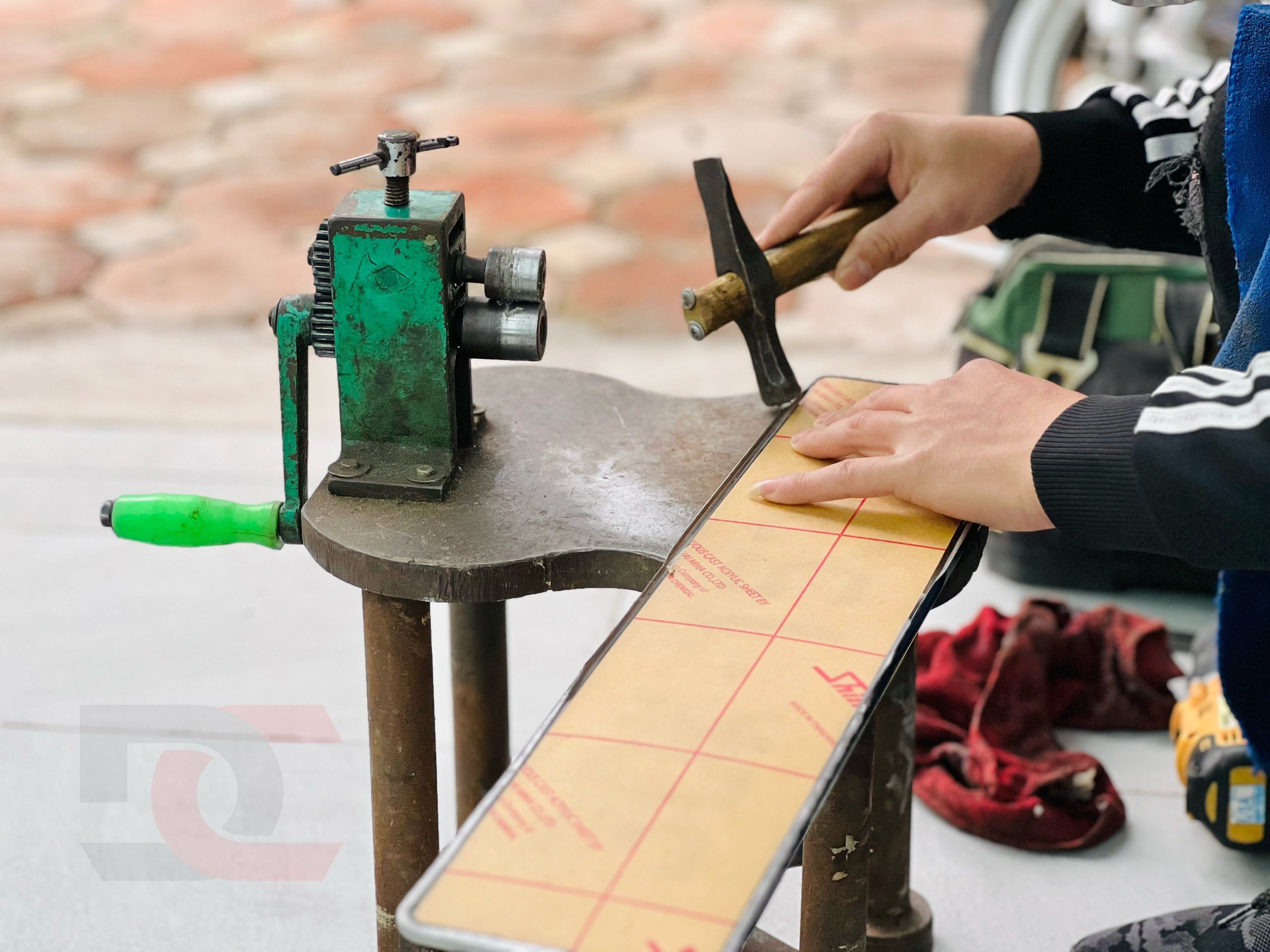 Bước này, các mép phôi sẽ được gõ bằng búa nhỏ để mép có thể giữ chặt biển số. Mép phôi cần phải gập phẳng và chính xác nhằm đảm bảo độ kín, chặt nhưng vẫn phải đảm bảo thẩm mỹ của biển số.