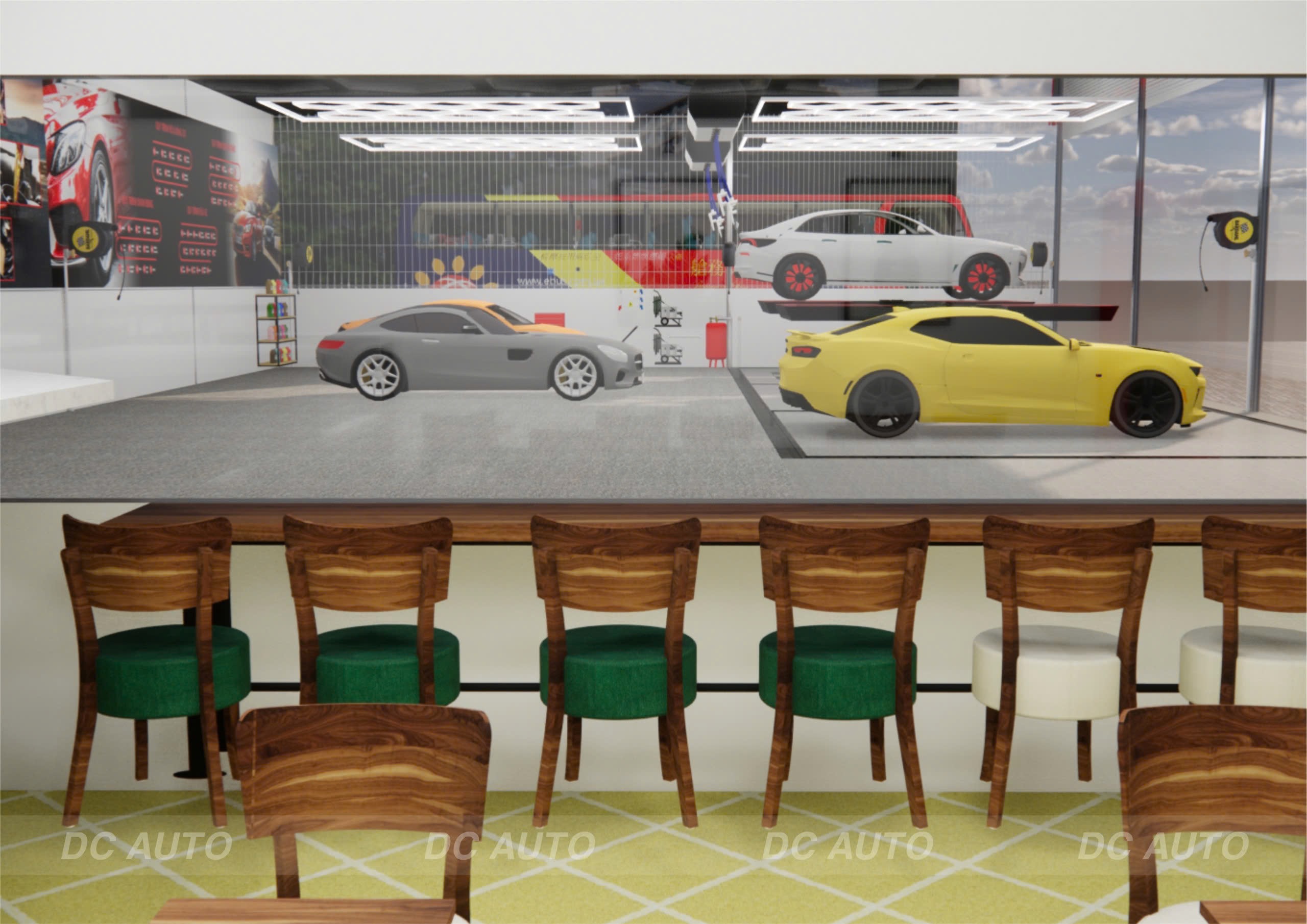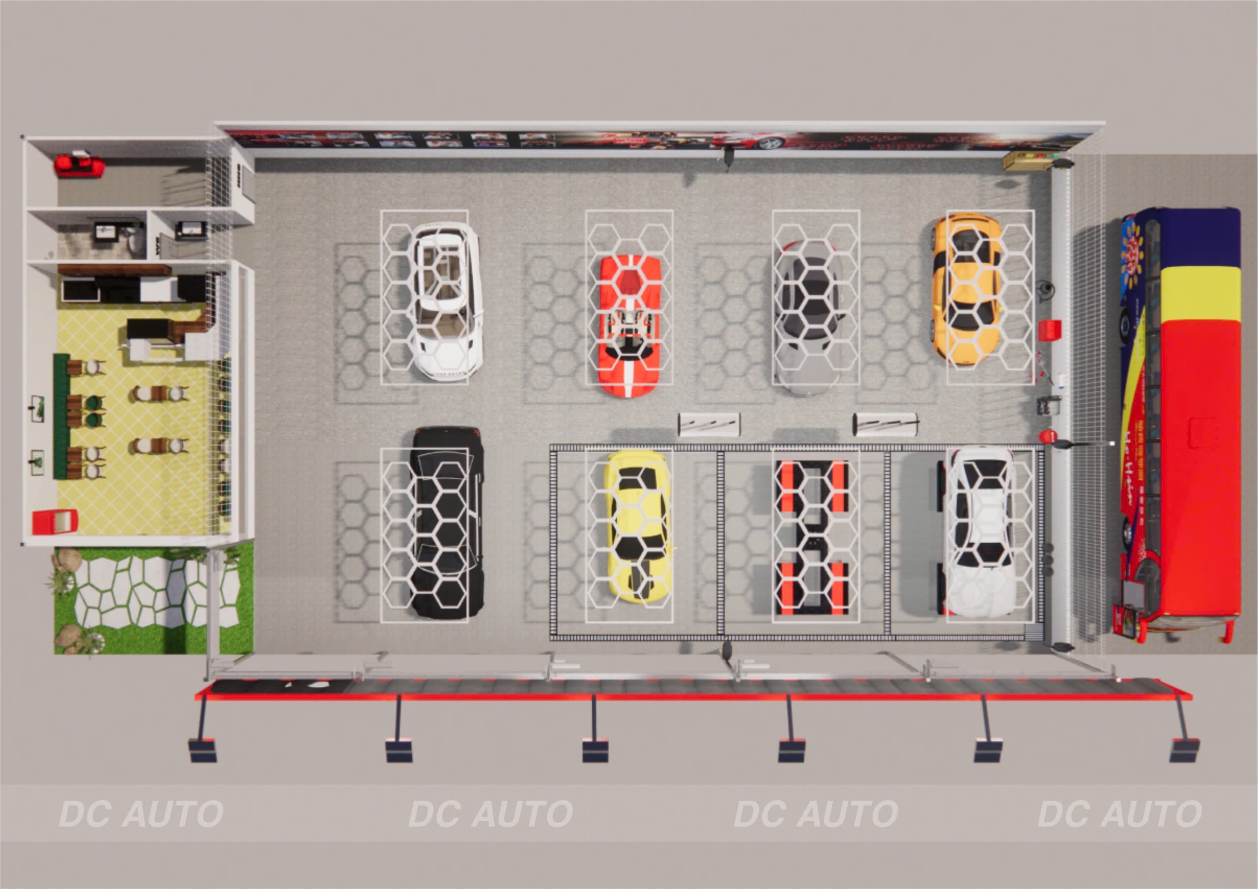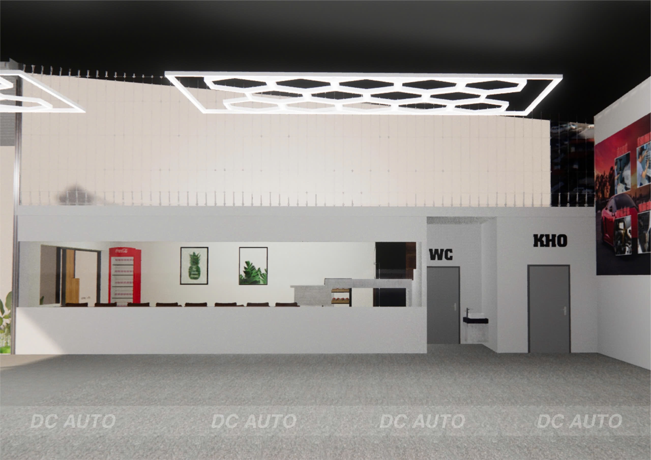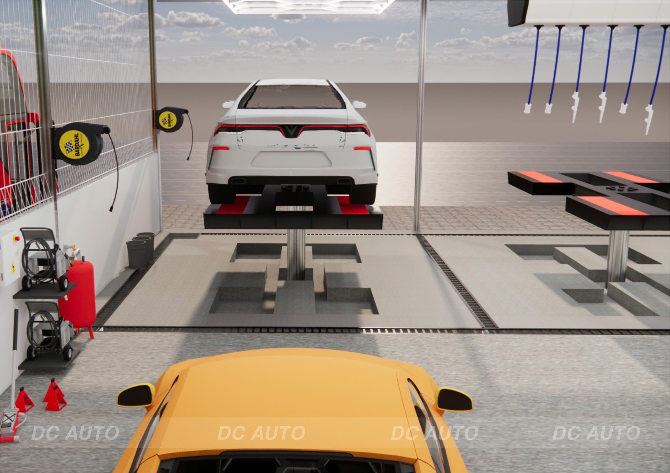 - 24m chiều ngang ở trung tâm là khu chăm sóc xe ô tô con, với công suất phục vụ cùng lúc khoảng 10 xe.
