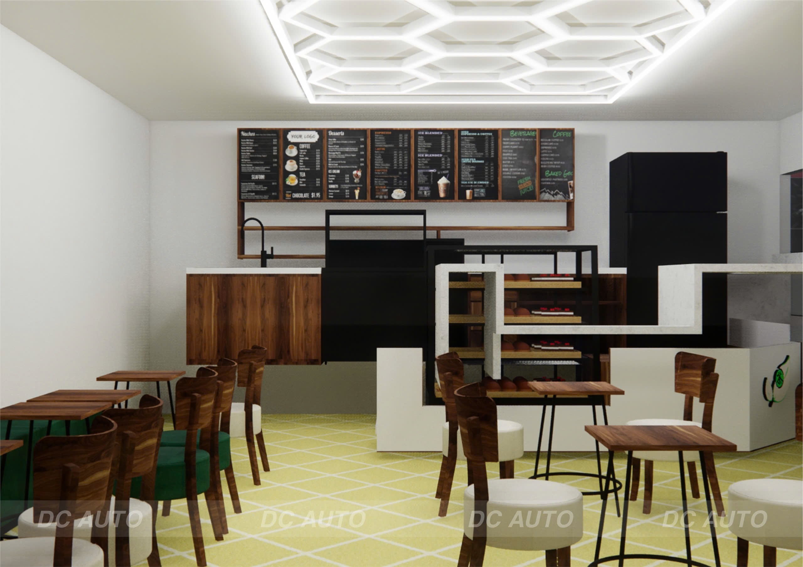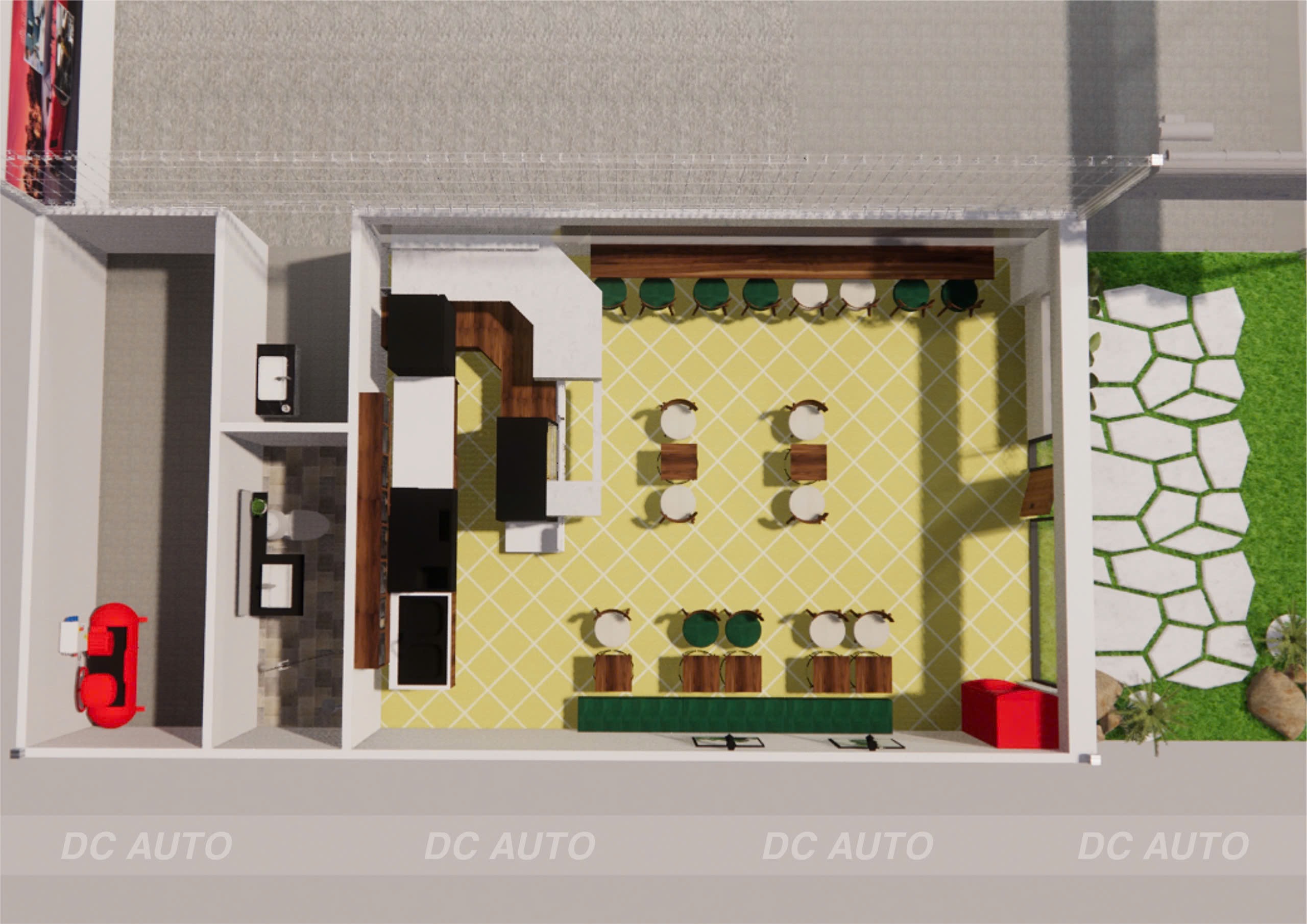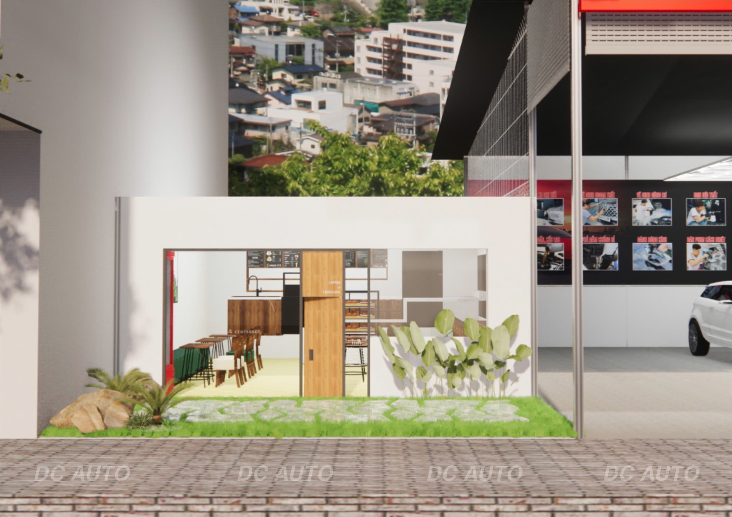 - 6m bên trái được dành làm khu cafe tiếp khách, khu vệ sinh và phòng kho chứa máy móc thiết bị – tạo không gian chờ văn minh và chuyên nghiệp.