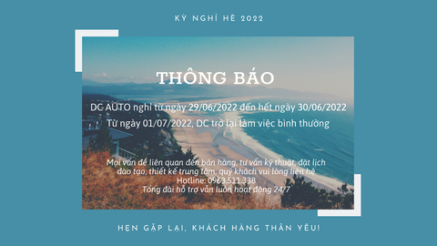 Xin kính chào quý khách hàng, DC Auto xin gửi đến các bạn thông tin về kỳ nghỉ hè 2022 của chúng tôi. Rất mong quý khách cập nhật và sắp xếp công v...