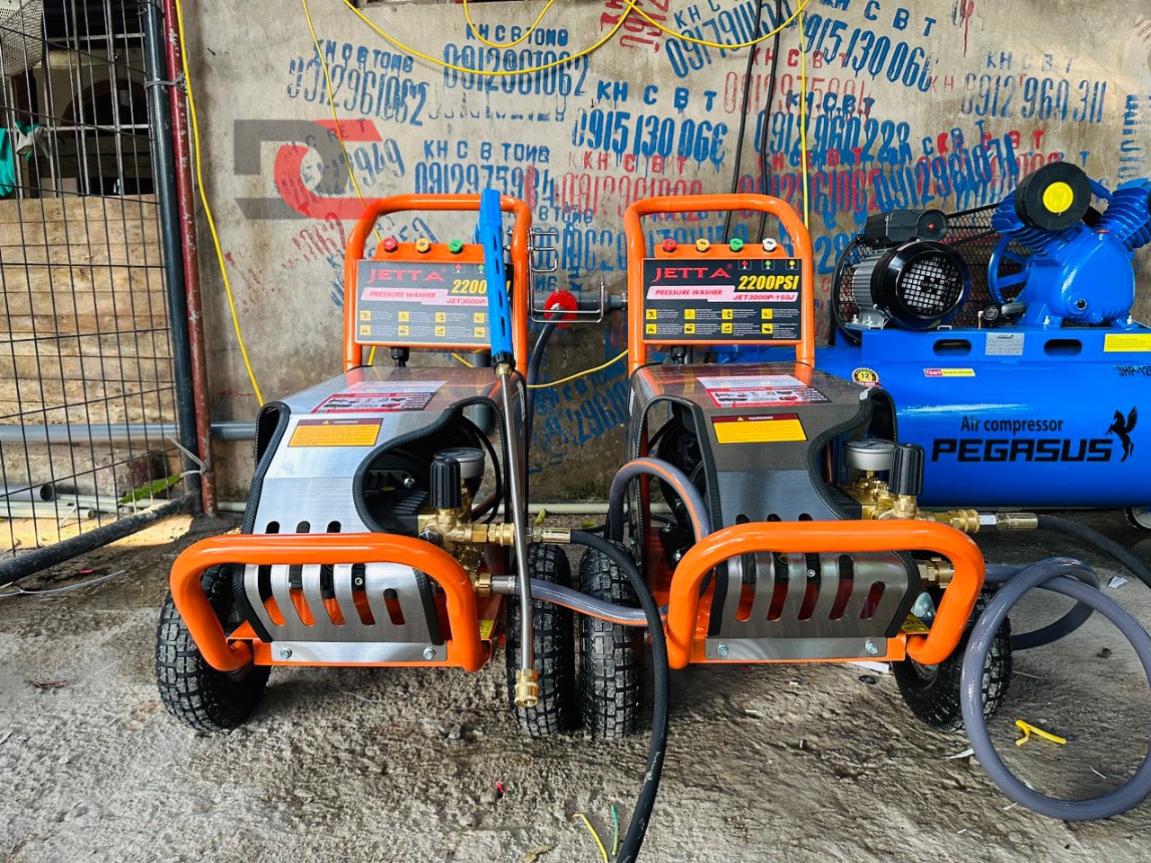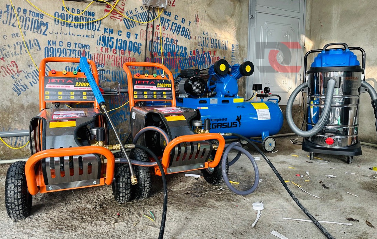 02 máy rửa xe cao áp Jetta - Model: JET3000P-150J công suất cực kì lớn, bộ phụ kiện đi kèm đầy đủ. Đầu tư máy rửa xe này rất tiết kiệm so với các máy rửa xe khác cùng phâ khúc. Tại trạm rửa xe của anh Thành, DC Auto lắp đặt máy rửa xe cho anh Thành không phải kiểu hút nước như thông thường, cắm điện mà chạy toàn bộ hệ thống đường ống nước phi 48 từ téc nước ra, chia đầu ra cho hai máy rửa xe và lắp quả lọc nước đầy đủ. Đường điện được lắp toàn bộ Aptomat cố định một chỗ.