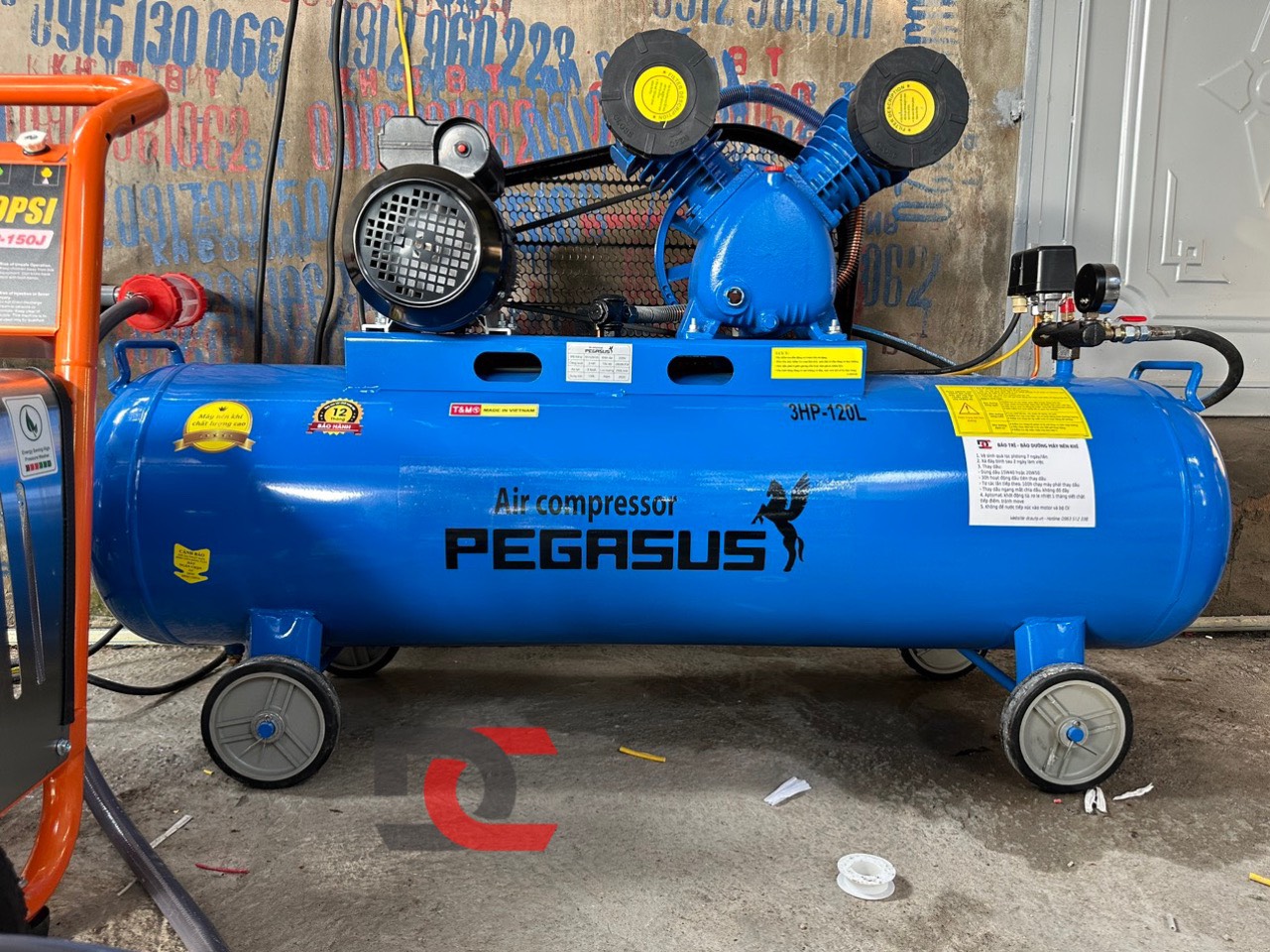 01 máy nén khí Piston Pegasus - Model: TM-V-0.25/8-120L, công suất vừa đủ cho công việc cấp bọt, bơm lốp, xì khô, bắn ốc, vệ sinh lazang, tắc kê được bình thường. DC Auto lắp đặt đường hơi bằng ống hàn nhiệt phi 25 chạy quanh trạm rửa xe, bố trí đầu ra hơi các khu vực cần thiết.
