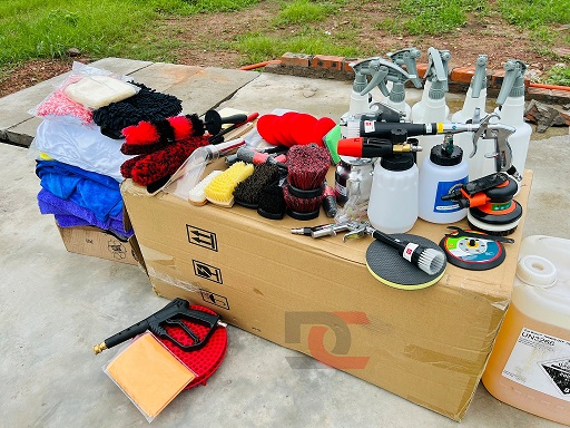 Bộ dụng cụ, đồ nghề rửa xe, chăm sóc xe: Súng dọn nội thất khí nén Tornador, bình xịt, khăn lau vỏ xe,...