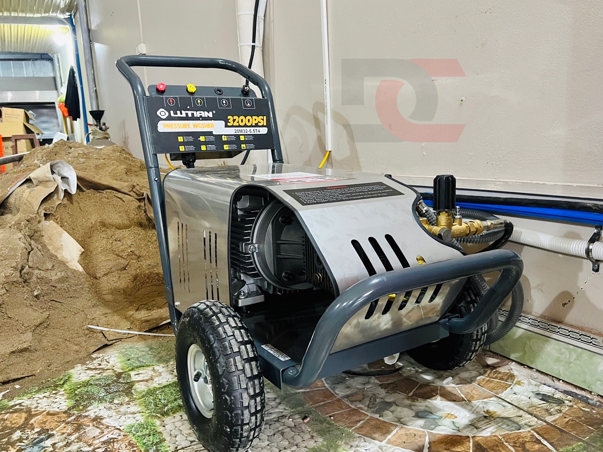 01 máy rửa xe cao áp Lutian - Model: 20M32-5.5T4 3200PSI được kết nối với tay quay 360° cho lực phun rửa mạnh mẽ. Súng áp lực của máy rửa xe được treo trên giá treo súng gọn gàng.