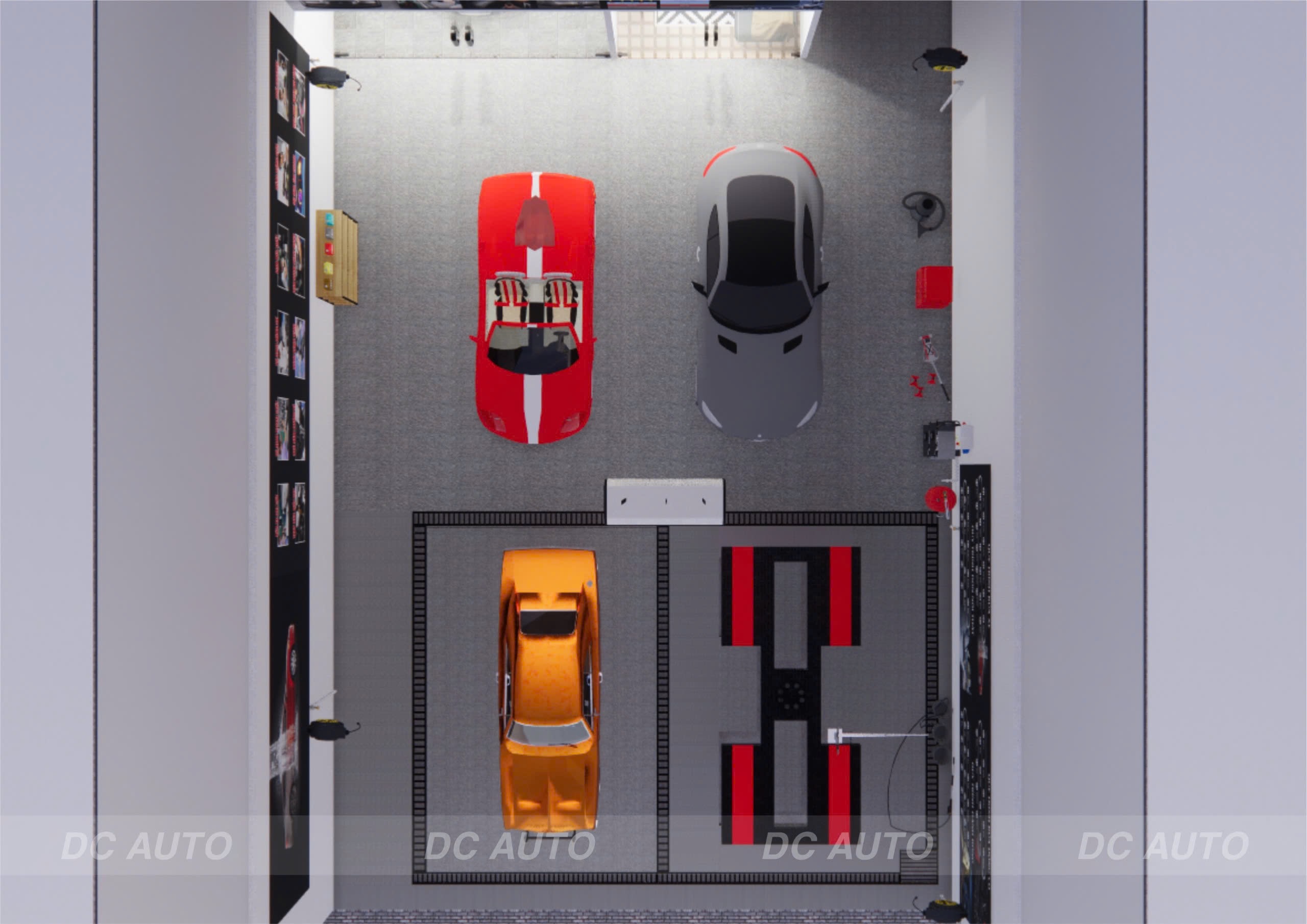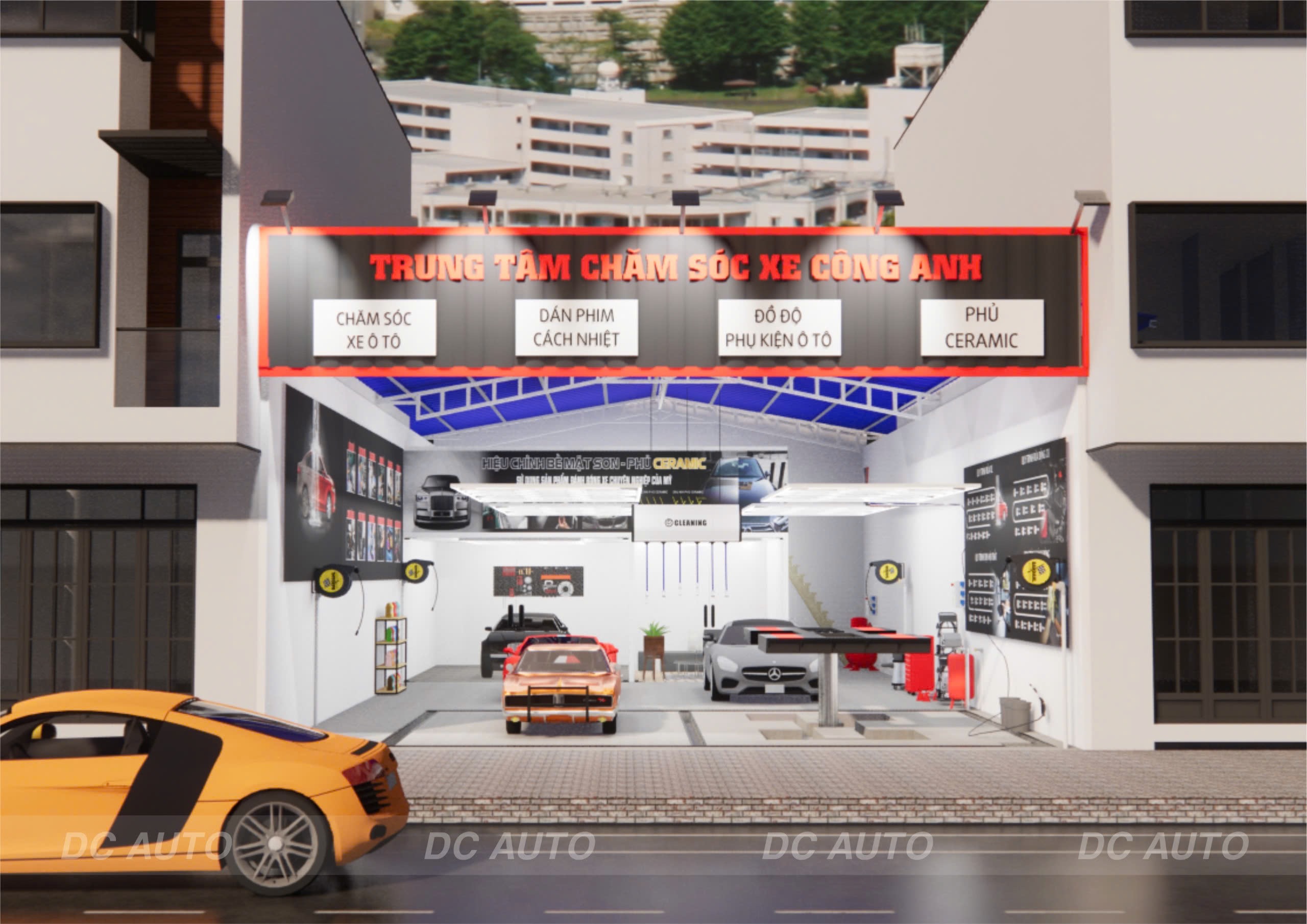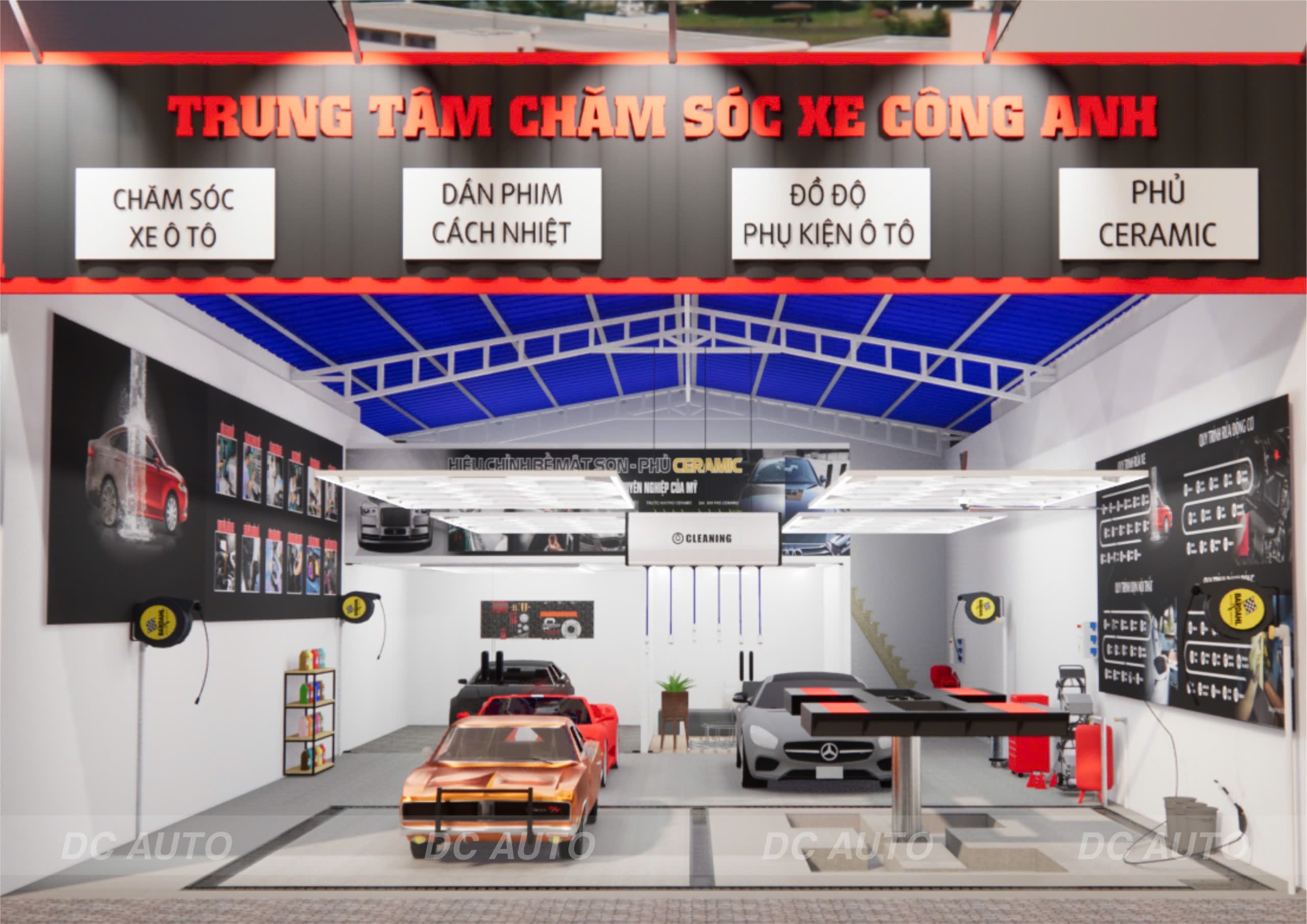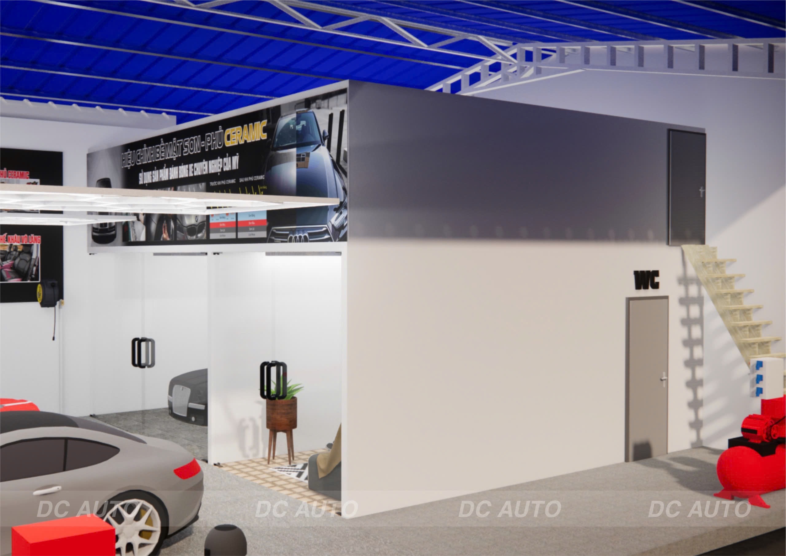 - Bên trong có 1 phòng chức năng riêng rộng 4,5m – sâu 6,5m, chuyên phục vụ các dịch vụ độ xe, nâng cấp xe, lắp đặt thiết bị âm thanh – màn hình.