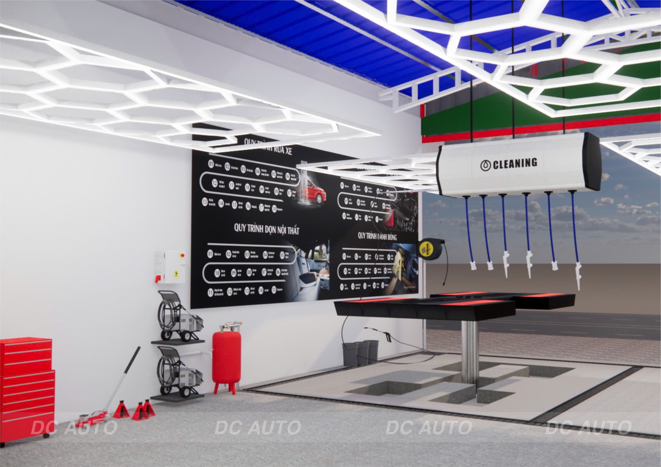 - Khu vực rửa ướt bố trí phía ngoài cùng, thuận tiện đón xe và xử lý bước làm sạch ban đầu.