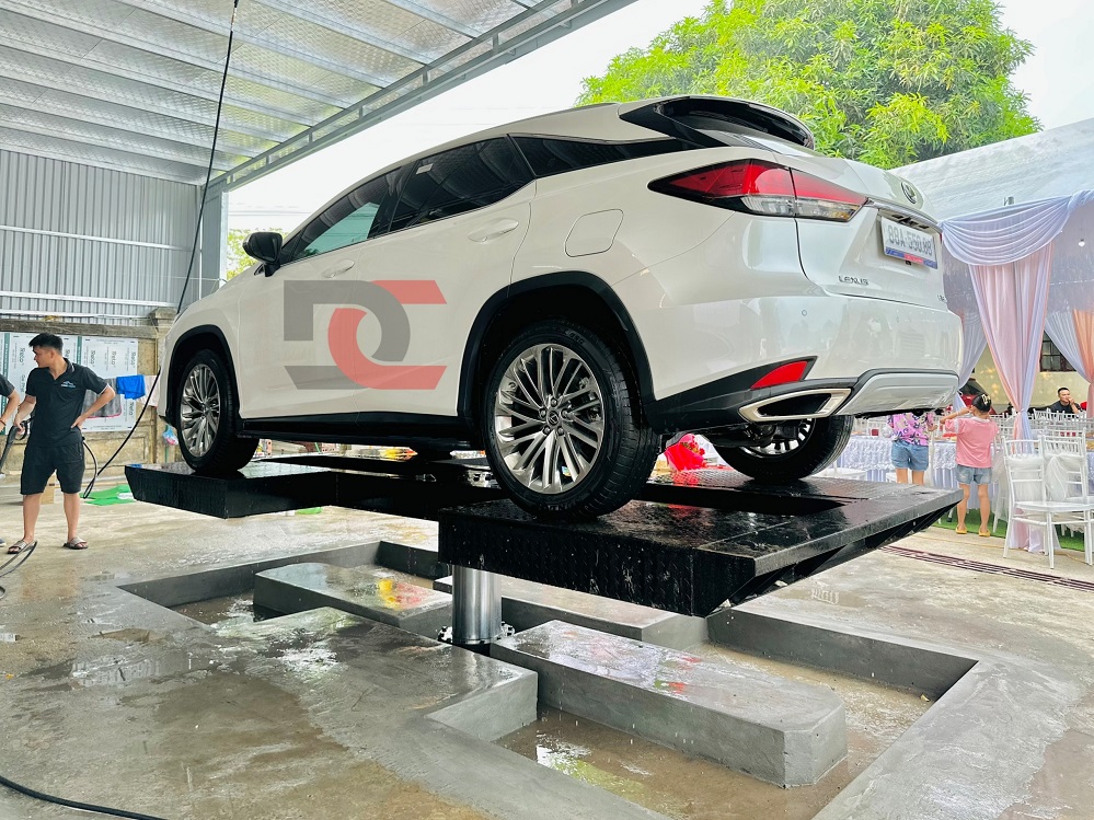 01 Cầu nâng 1 trụ Ấn Độ âm nền mặt cầu 4 cánh, hiệu Airtek. Được lắp đặt tại khu vực rửa xe, chuyên phục vụ cho công việc rửa xe con.