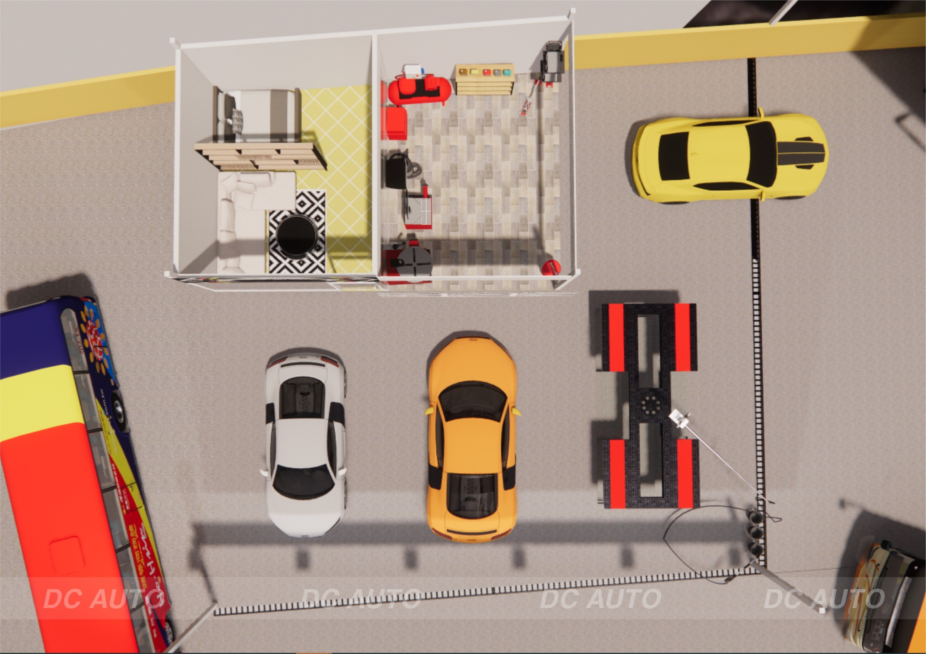 Khu vực bên tay phải từ ngoài vào chính là khu vực rửa xe có cầu nâng, tiếp đến khoang giữa là khu vực làm dịch vụ chăm sóc xe chuyên sâu như rửa máy, dọn nội thất, khoang cuối cùng bên tay trái được bố trí làm khu vực lắp đặt đồ chơi. Bên trong thẳng với khu vực lắp đặt đồ chơi là phòng tiếp khách, cũng chính là phòng để trưng bày đồ chơi, hoá chất chăm sóc xe, hoá chất bán kèm.Phòng này toàn bộ được làm bằng kính cường lực có thể nhìn ra bên ngoài, và mọt phòng nghỉ ngơi cho nhân viên sát bên.