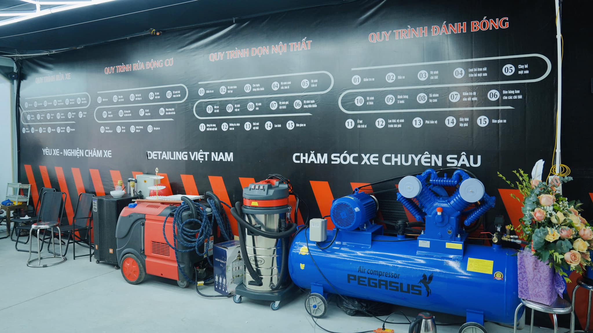 Ngoài hoá chất, tủ trưng bày, bên trong khoang làm khô còn có máy hút bụi được dùng để hút bụi bên trong nội thất xe, xe đẩy dụng cụ 3 ngăn được dùng cho việc rửa máy, dọn nội thất, máy hút dầu thải để phục vụ cho công việc thay dầu, thay cốc lọc dầu. Cùng với đó là bộ hộp dây rulo rút để cấp hơi, được treo toàn bộ trên cao.
