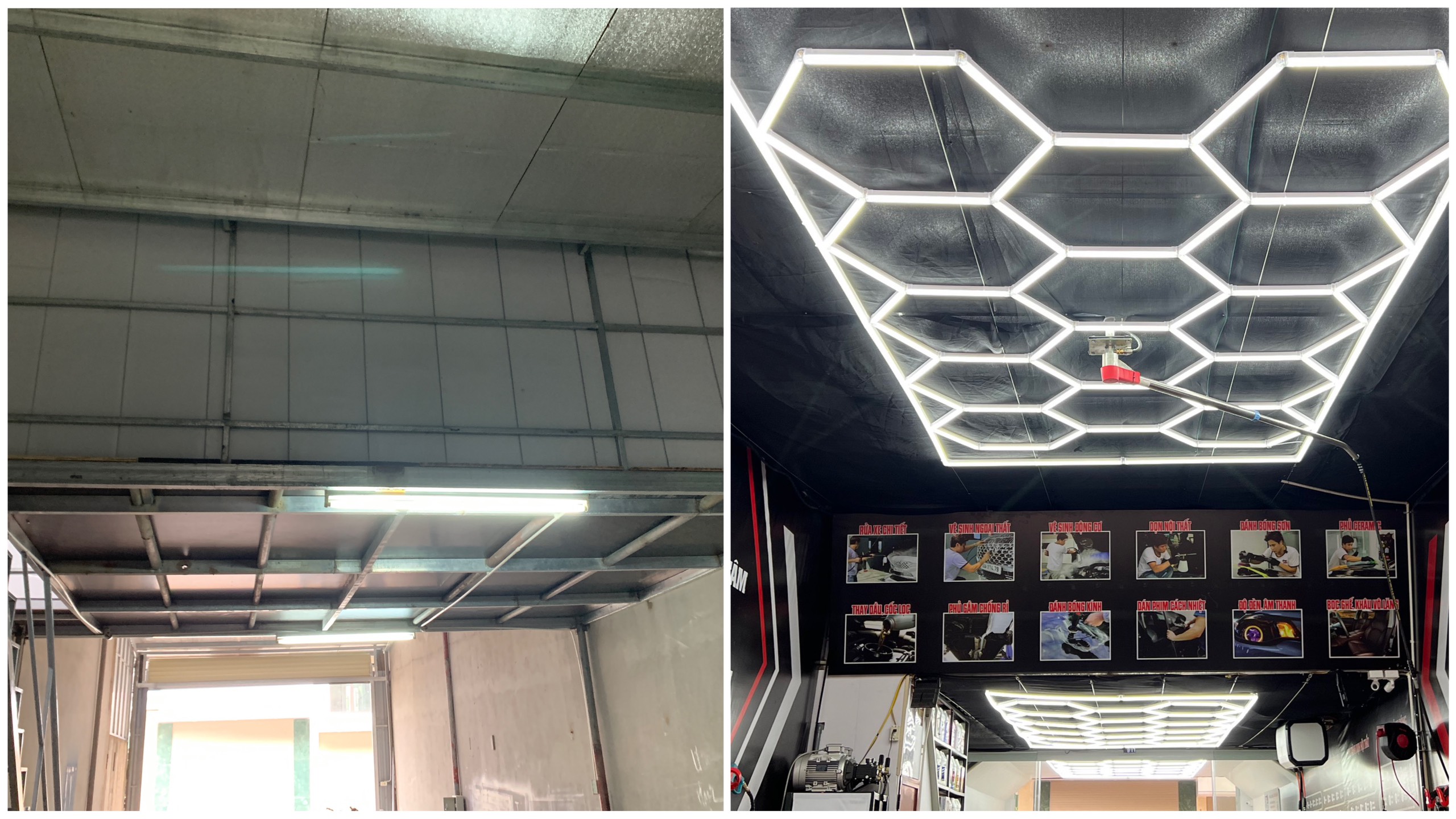 Hệ thống ánh sáng tại khoang rửa xe cầu nâng được lắp dàn đèn tổ ong bên trên, cung cấp ánh sáng phân bổ toàn khoang, tránh được dây điện loằng ngoằng.