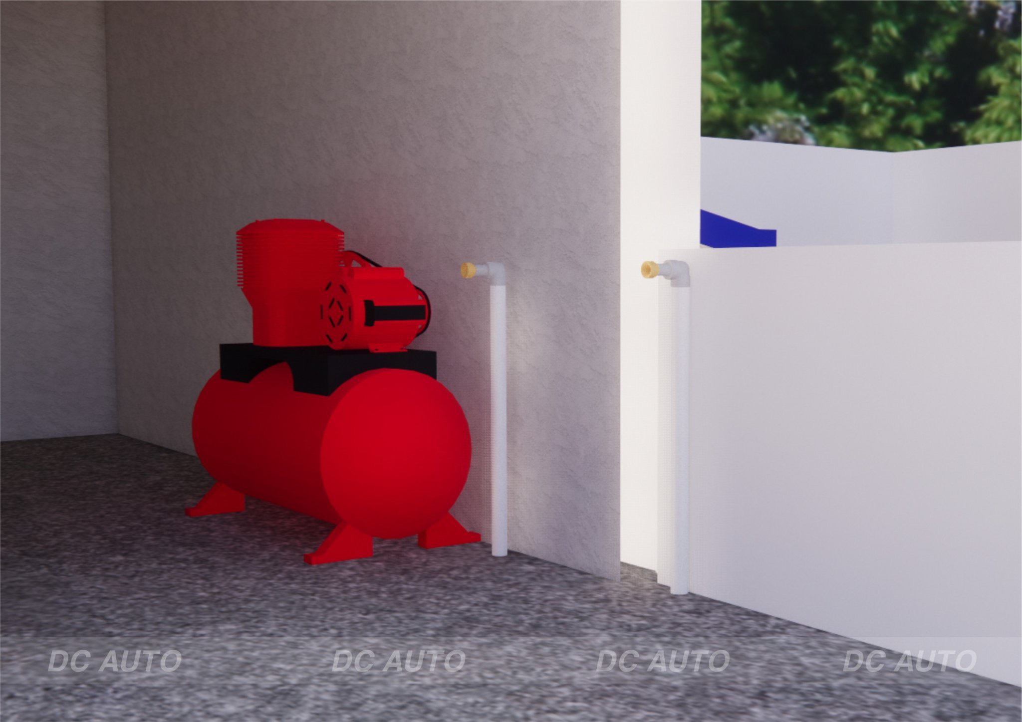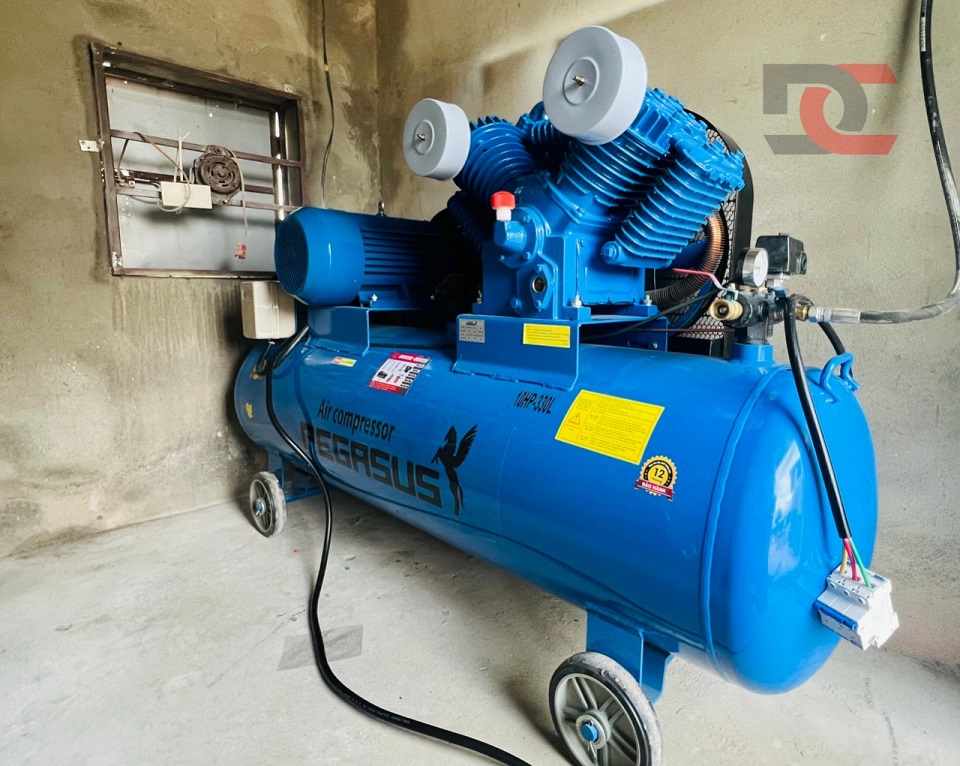 01 Máy nén khí Piston Pegasus - Model: TM-1.05/12.5-330L, bình chứa 330 lít. Máy nén khí được đặt cố định trong phòng kho, giúp giảm độ ồn cho trung tâm và tránh khỏi các khu vực có nước, đầu ra hơi được kết nối qua bộ tách nước, đảm bảo hơi ra được khô nhất có thể. Toàn bộ hệ thống đường hơi được chạy bằng ống hàn nhiệt bố trí các điểm ra hơi cần thiết bao quanh trung tâm.