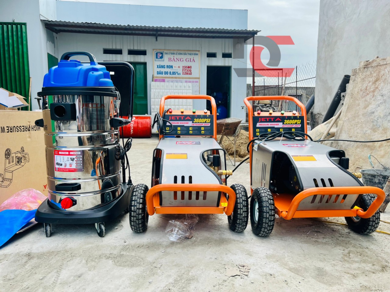 02 Máy rửa xe cao áp Jetta - Model: JET5500P-250T, công suất tối đa 3600PSI, rất khoẻ. Một máy được kết nối với tay quay rửa xe 360°.