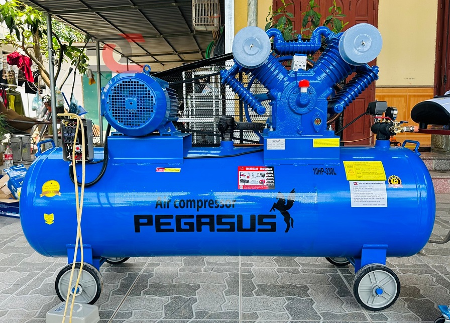 01 Máy nén khí Piston Pegasus - Model: TM-1.05/12.5-330L, công suất 7.5Kw tương đương 10HP, vòng quay 1450rpm, áp lực làm việc 12.5 bar cực kì khoẻ. Với đầu nén kép có thể lắp thêm bình tích khí 500 lít vẫn có thể kéo được bình thường.