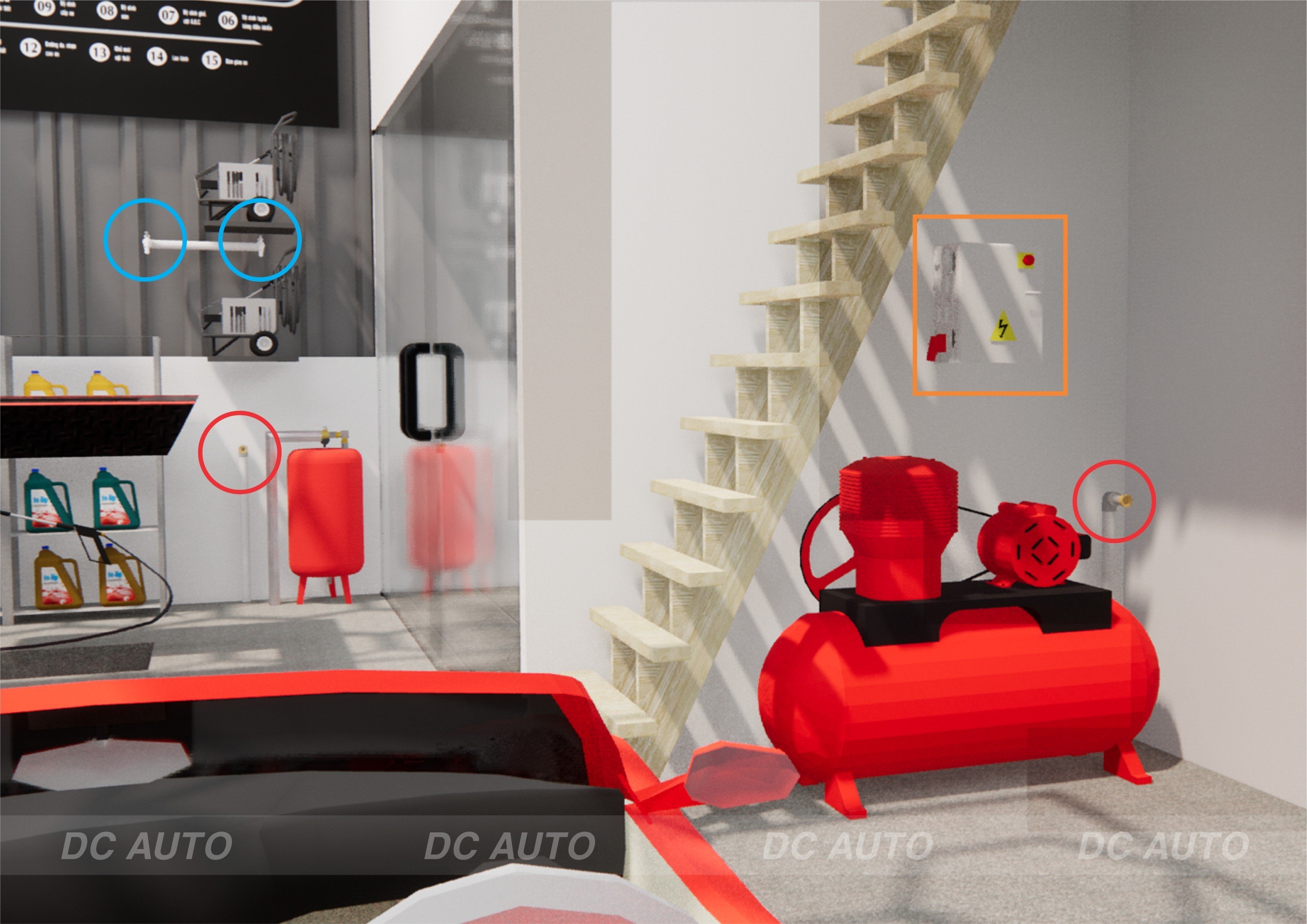 Bên tay trái nhà xưởng nhìn vào được bố trí làm khu vực rửa xe có cầu nâng. Được lắp đặt 1 bộ cầu nâng 1 trụ Ấn Độ, âm nền, kiểu cầu cánh bướm, tính từ tường ra vị trí tâm cầu là 2.5m. Đảm bảo vẫn thao tác được bình thường và không làm tốn diện tích trung tâm nhà xưởng, phía bên trong vẫn có thể để được bình dầu, hệ thống nước, hệ thống xô,...Từ ngoài vào là 3.9m có thể đứng bên trong thao tác rửa được những dòng xe dài nhất như Limousine, xe bán tải. Khu vực này được tính toán đường nước bao quanh và có hố ga thoát toàn bộ ra ngoài. Mái cao 8m, bên trên được lắp đặt 1 tay quay 360°, phục vụ tối đa cho việc rửa xe.