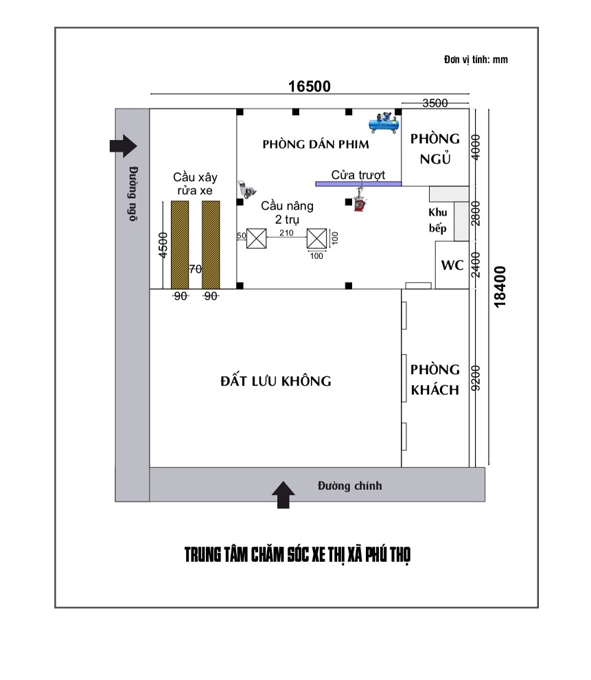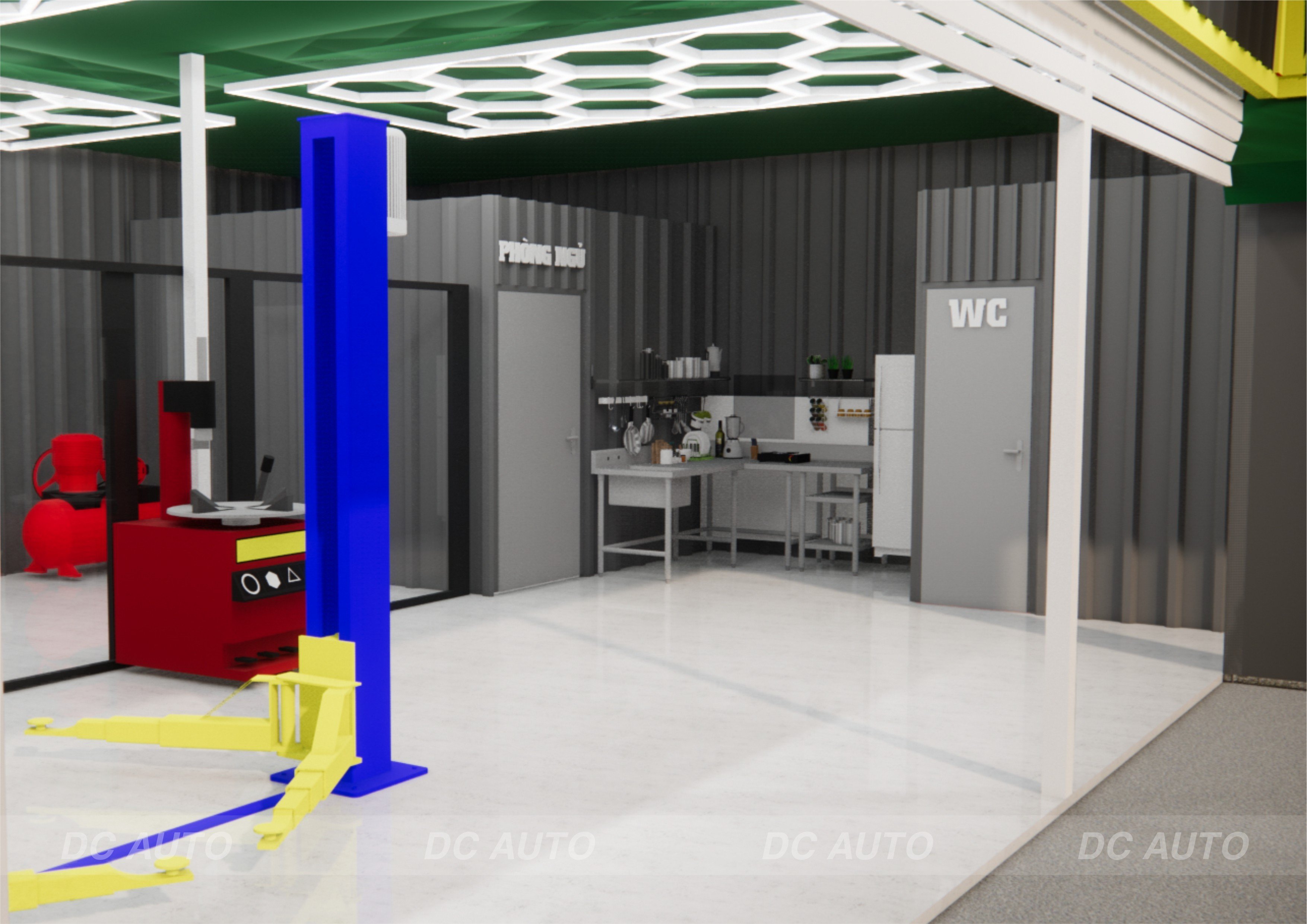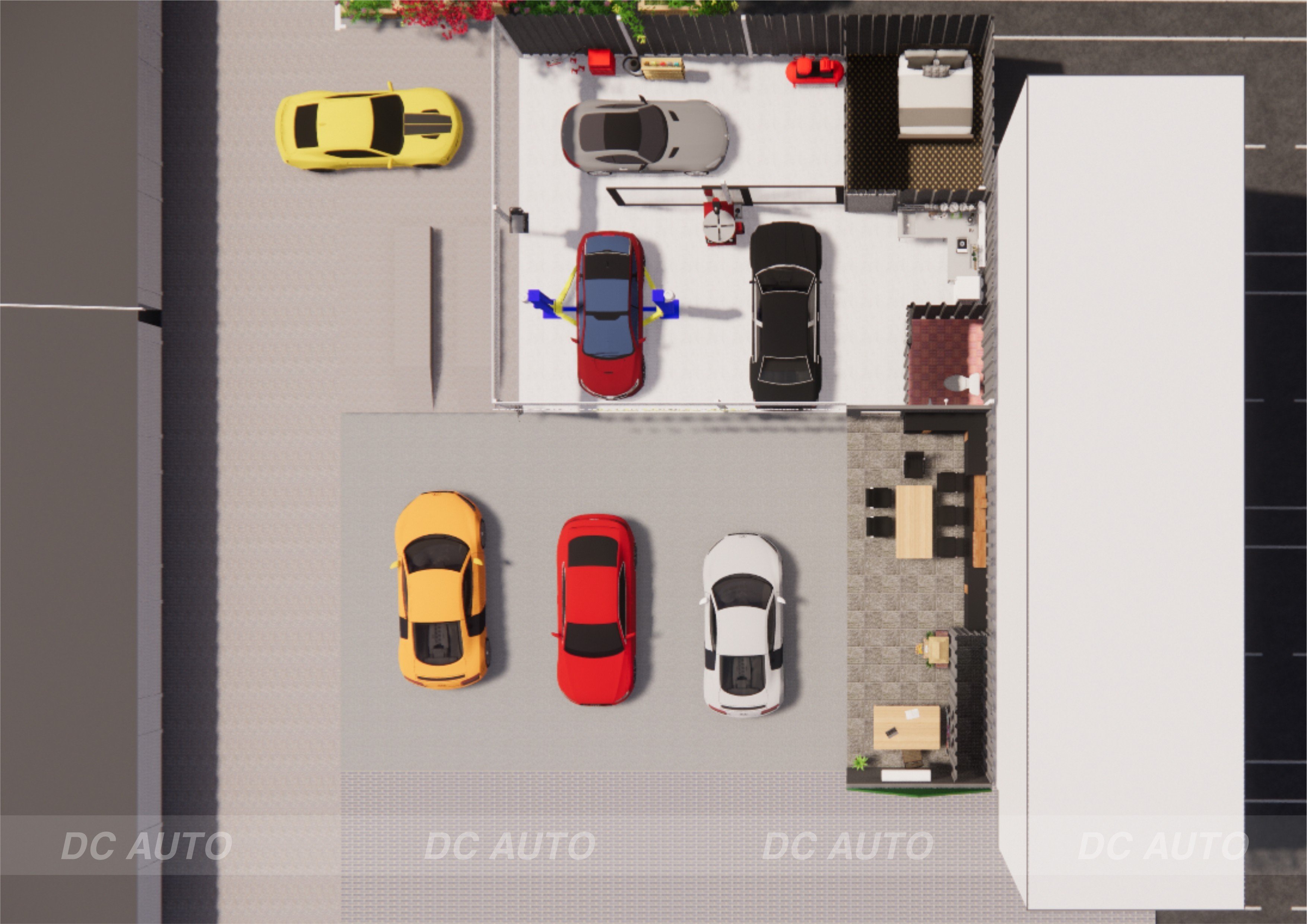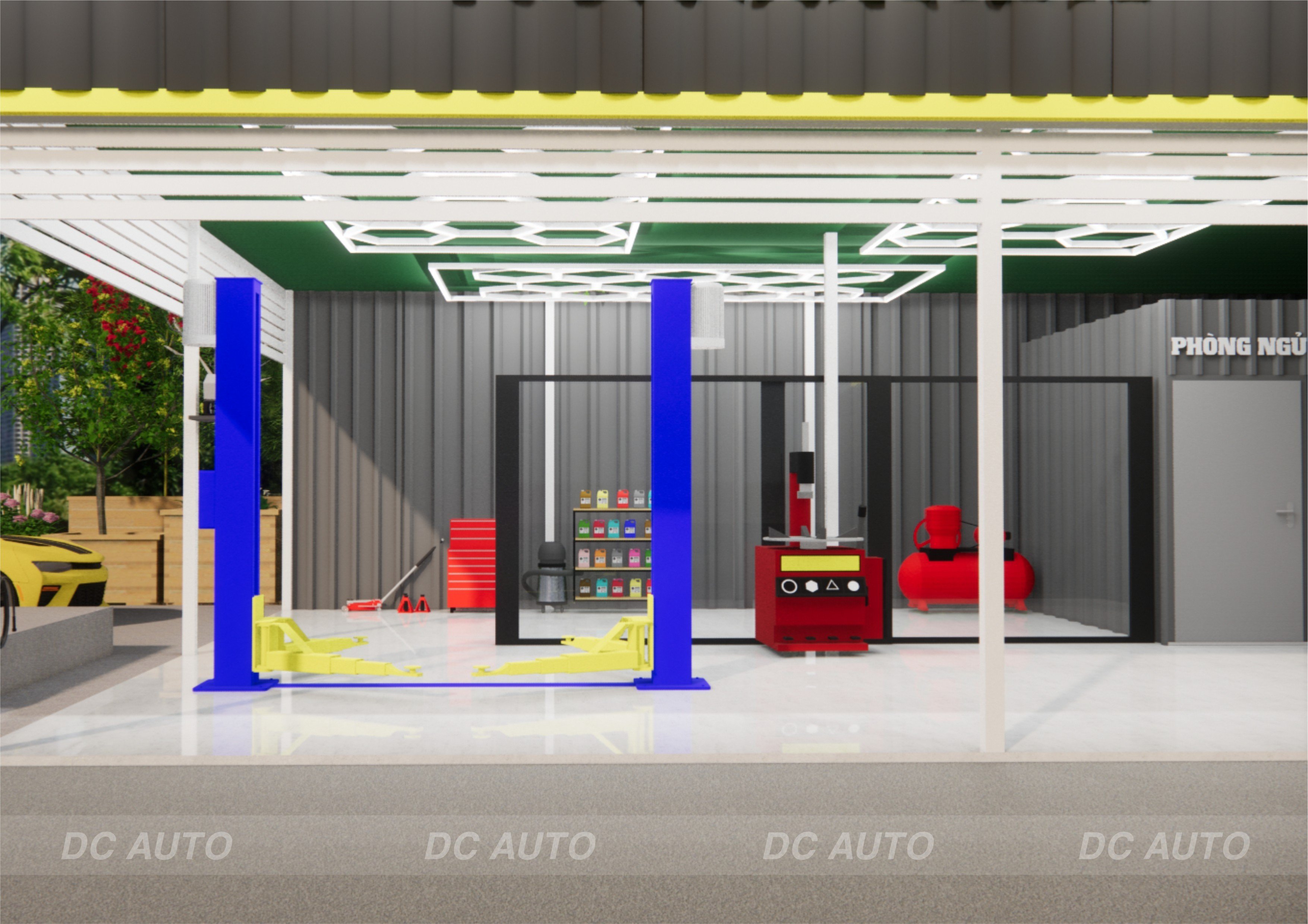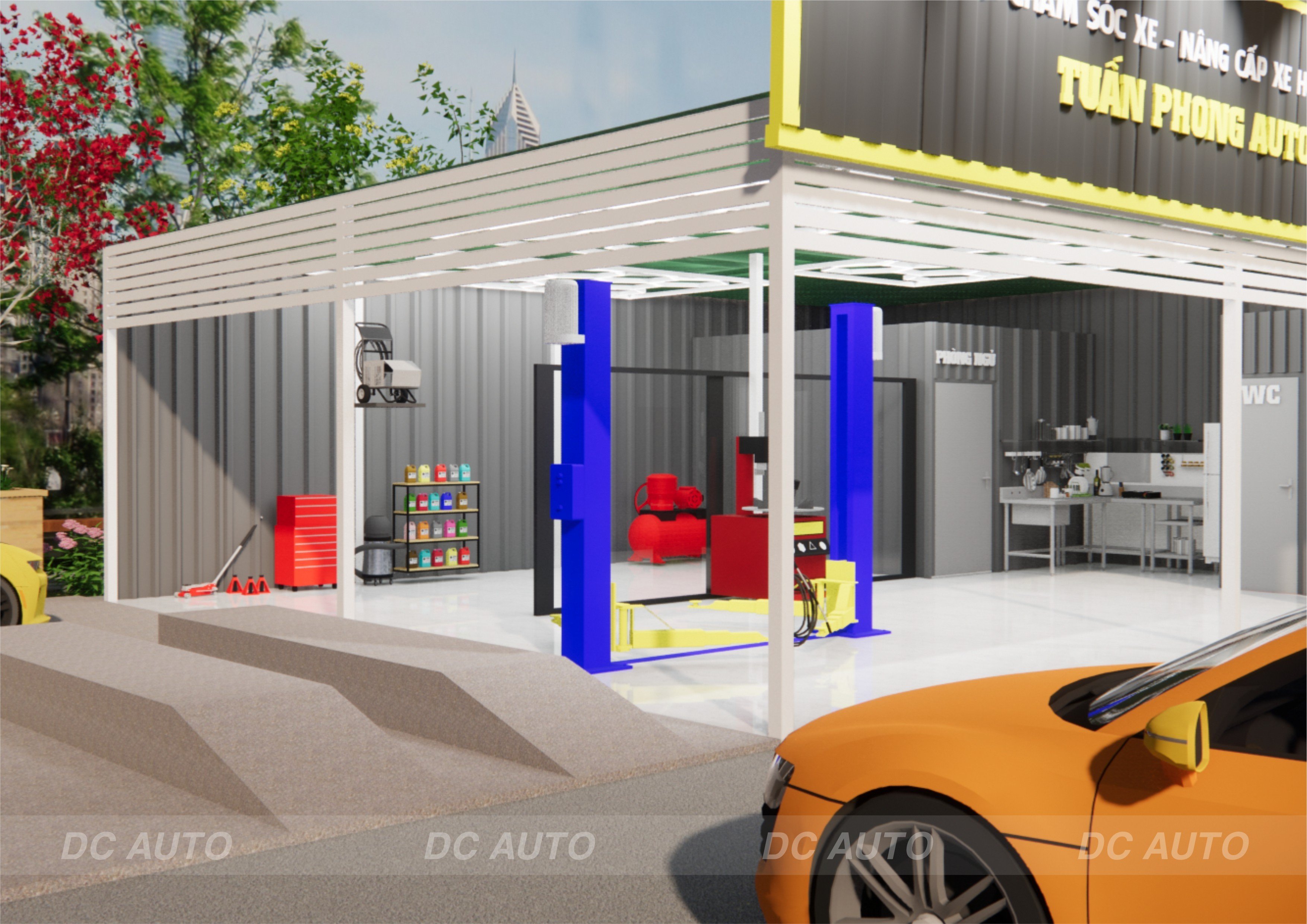Từ ngoài vỉa hè tiến vào chính là khu vực rửa xe, rơi vào khoảng 8m. Toàn bộ xe đến làm dịch vụ rửa xe sẽ được rửa sạch và làm khô ngay tại đây. Tiến vào bên trong là khu vực được xây dựng có mái và chia phòng. Được chia thành 3 khoang dịch vụ chính. Ngay bên tay trái là khoang dịch vụ sửa chữa nhanh, bên cạnh là khoang làm lốp, tiếp theo là khoang làm dịch vụ chuyên sâu như: rửa máy. dọn nội thất, lắp đặt đồ chơi, dán phim,...Phía bên tay phải chính là dãy nhà được thiết kế làm phòng tiếp khách, có đầy đủ phòng vệ sinh, khu bếp và 1 phòng cho nhân viên nghỉ ngơi với đầy đủ tiện nghi.