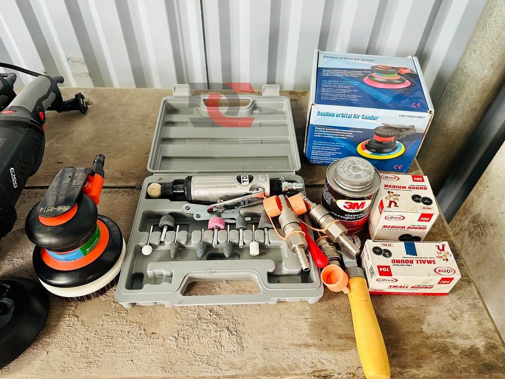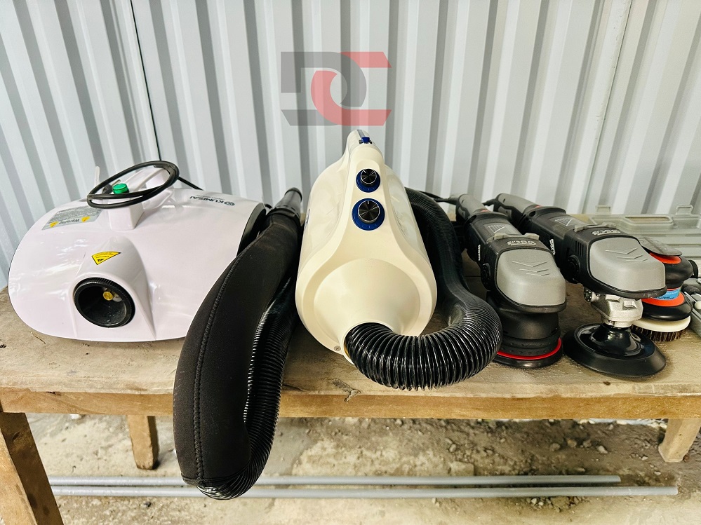 Bộ dụng cụ, máy móc chăm sóc xe: Máy thổi khí nóng SGCB, máy xông tinh dầu, máy đánh nội thất, bàn chải, khăn lau xe,....