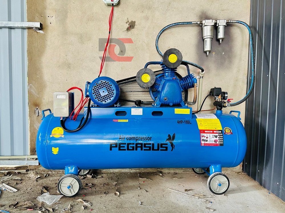 01 Máy nén khí Piston Pegasus - Model: TM-W-0.36/12.5-180L, công suất làm việc 4HP, dung tích bình chứa 180 lít. Đường hơi chia trực tiếp lên hệ thống quả tách nước, đưa đường hơi ra bên ngoài, có các đầu ra hơi tại các vị trí cần thiết.
