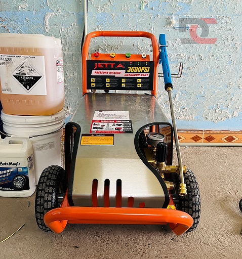 Đầu tiên một thiết bị không thể thiếu được trong trung tâm chăm sóc xe, đó chính là máy rửa xe. DC Auto đang cấp cho anh Hoà một máy rửa xe cao áp Jetta - Model: JET5500P-250T, áp lực cực kì lớn. Máy rửa xe được đặt cố định tại khu vực rửa xe và kết nối với 1 tay quay rửa xe 360°, được lắp đặt phía trên, chính giữa khoang dịch vụ rửa xe.