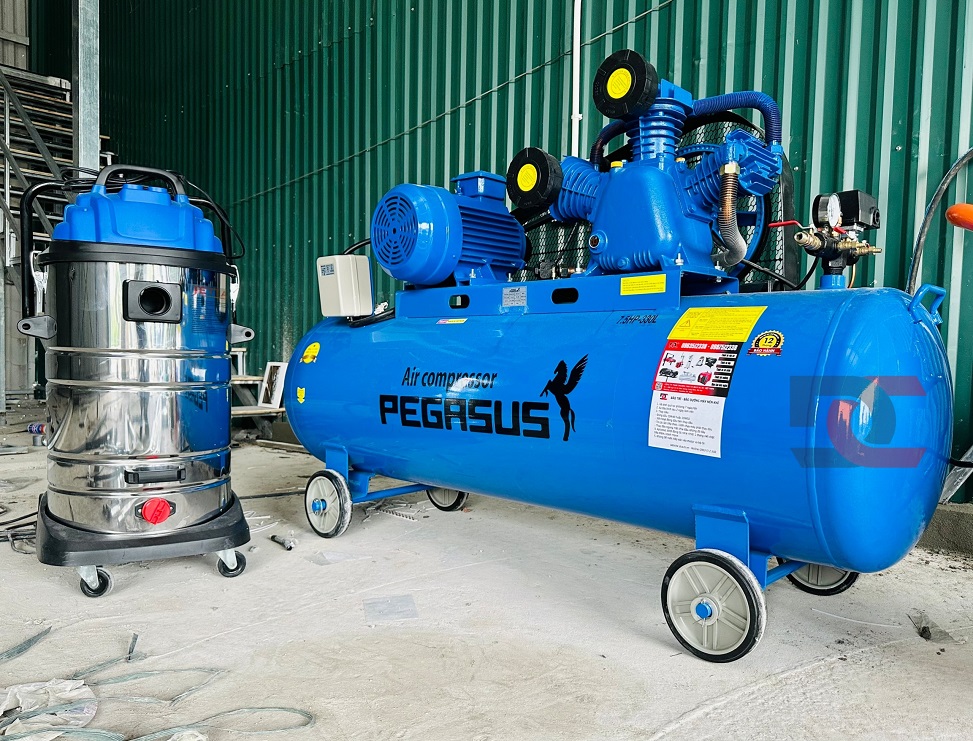 01 Máy nén khí Piston Pegasus - Model: TM-W-0.67/12.5-330L, bình chứa 330 lít. Vẫn đáp ứng được yêu cầu lắp đặt thêm cầu nâng 1 trụ sau này khi có nhu cầu.