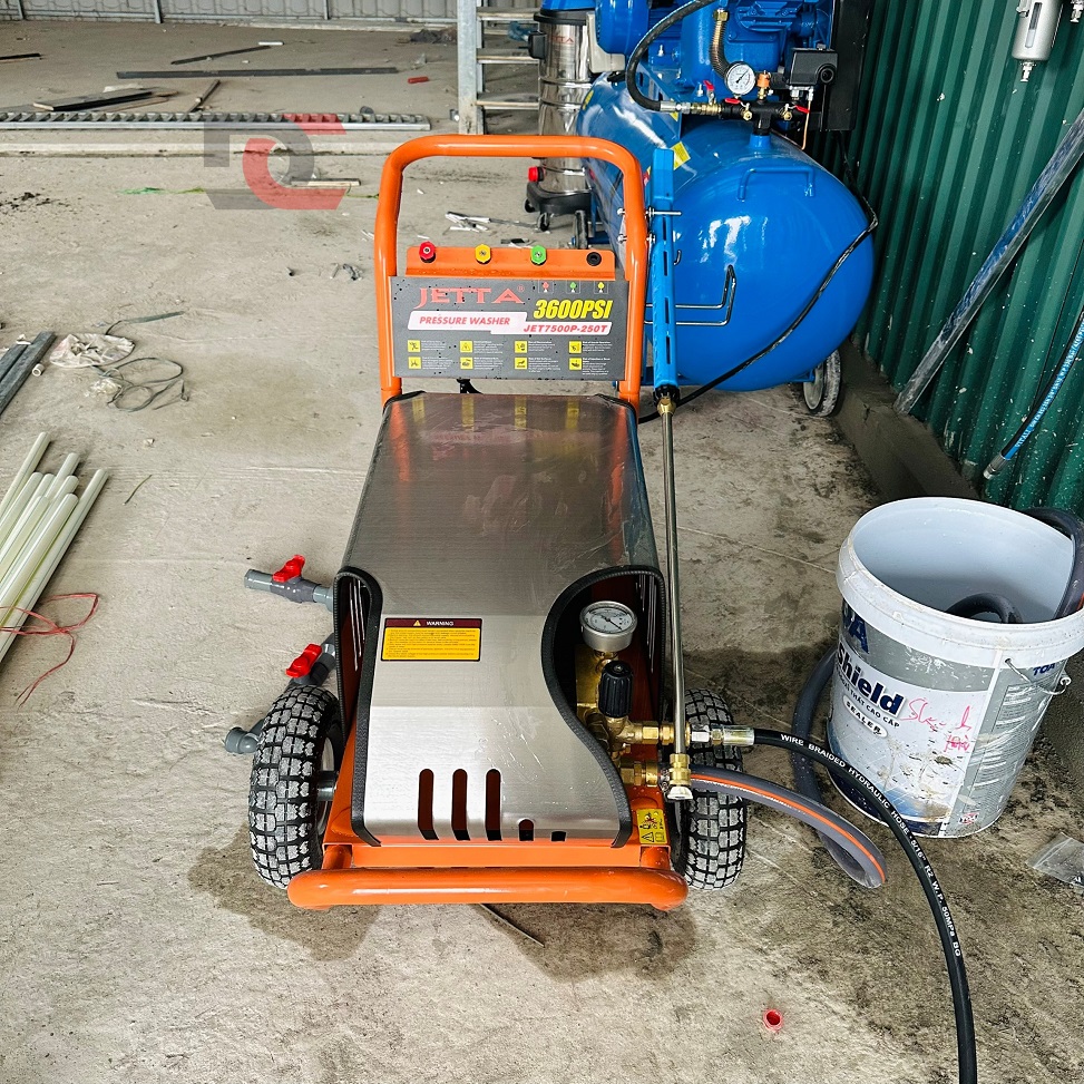 01 Máy rửa xe cao áp Jetta - Model: JET7500P-250T, áp lực đầu ra tối đa 3600PSI, điện áp sử dụng 380V.