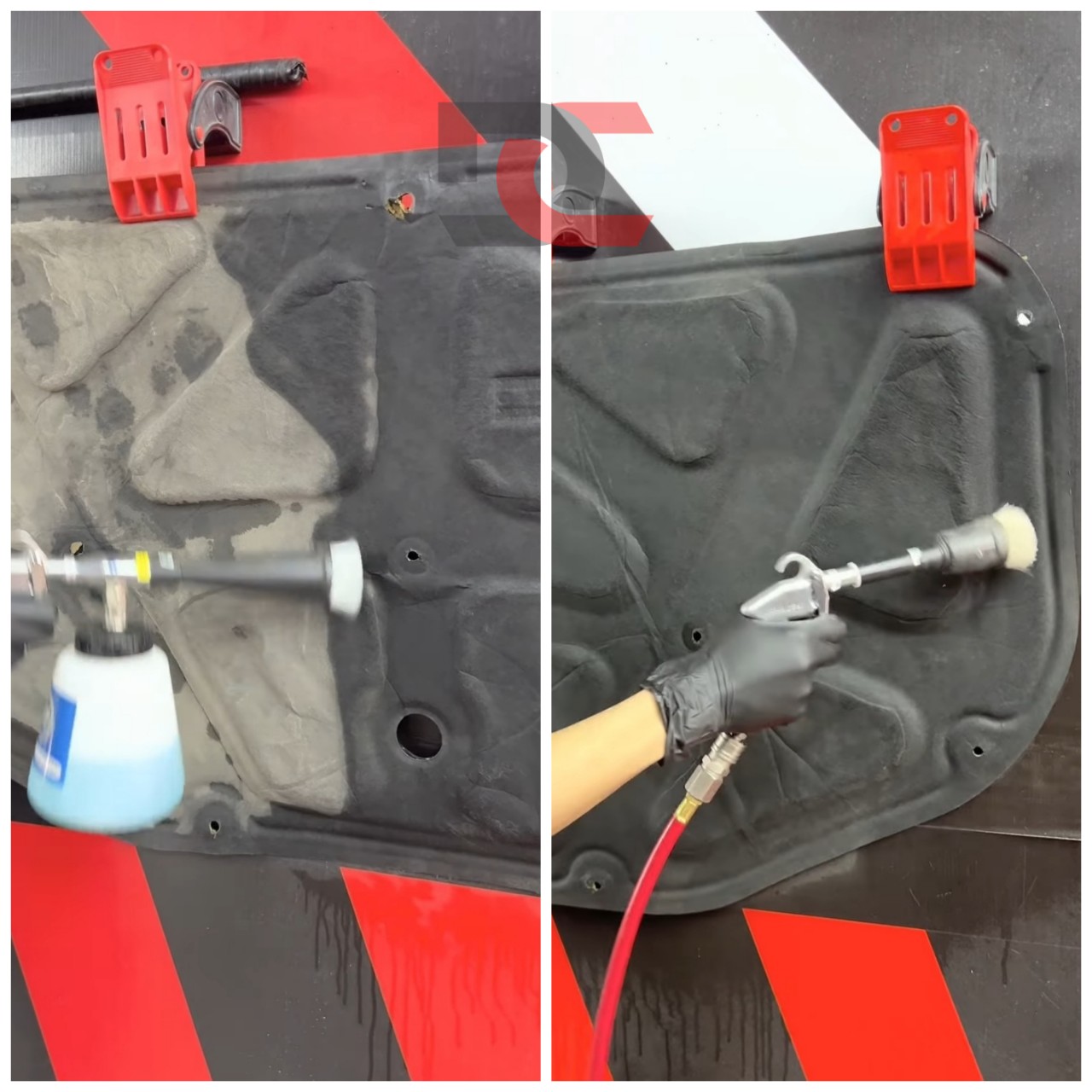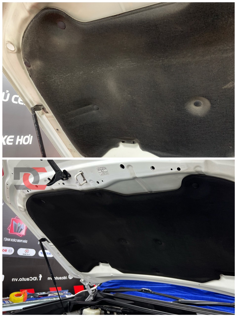 Ở đây, với tấm cách nhiệt dưới nắp capo có cấu tạo 3 lớp - một lớp được làm bằng chất liệu nỉ cao cấp, lớp ở giữa được làm bằng bọt biển cách nhiệt, chịu nhiệt tốt và một lớp mỏng dạng giấy ép. DC Auto tiến hành thực hiện vệ sinh hai công đoạn khác nhau.