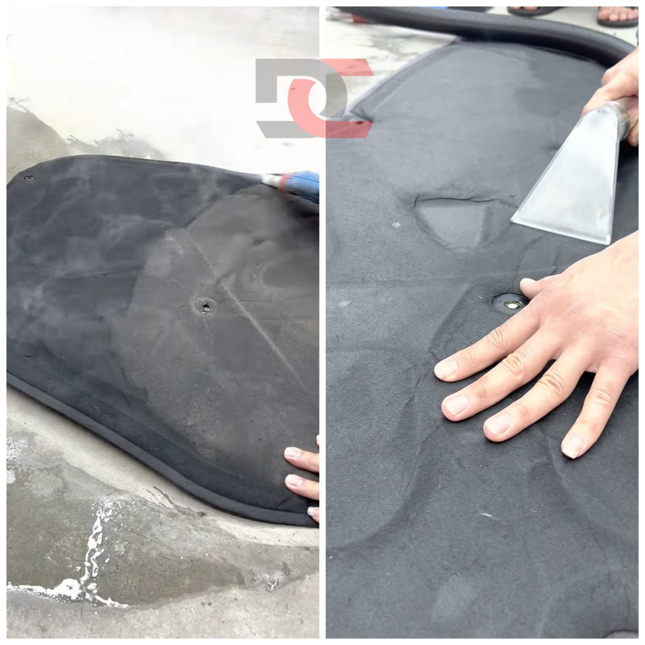 - DC Auto vệ sinh bằng máy hơi nước nóng, xịt trực tiếp nước lên bề mặt, rồi xịt một lớp dung dịch tẩy rửa. Đánh sạch bằng bàn chải chuyên dụng và dùng mỏ vịt trơn hút khô. Hút thật khô tránh để đọng nước vào phần bọt biển ở giữa tấm cách nhiệt.